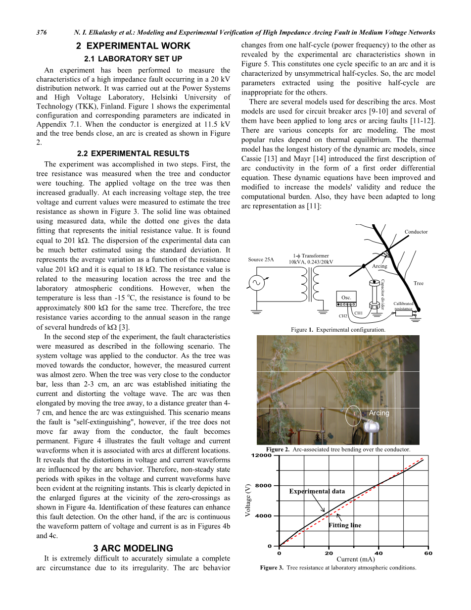 实验分两步完成。首先,当树和导体接触时测量树阻力。然后,树上施加的电压逐渐增加。在每个增加的电压阶跃时,测量树木电压和电流值以估计树木电阻,如图3所示。实线是使用测量数据获得的,而虚线表示初始电阻值的数据拟合。它被发现等于201kOmega;。使用标准偏差估计实验数据cn的偏差会更好。它表示的平均变化量是电阻值201kOmega;的函数,它等于18kOmega;。电阻值与整个树木的测量位置和实验室大气条件相关。但是,当温度低于-15\C时,对于同一棵树,发现电阻约为800kOmega;。因此,树木的抗性根据每年的季节而变化,范围在几百kOmega;[3]。