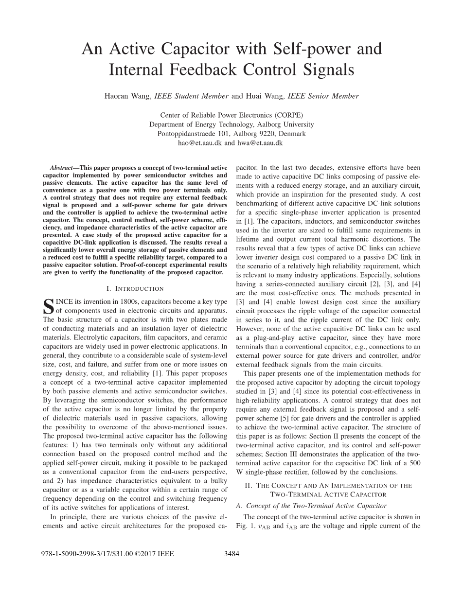 本文提出了一种由功率半导体开关和无源元件实现的双端有源电容的概念。有源电容器只有两个电源端子,并且与无源电容器的功能相同。本文提出了一种不需要外部反馈信号的控制策略,并采用自驱动的栅极驱动器和控制器来实现双端有源电容器的制作,以及有源电容器的概念、控制方法、自供电方案、效率以及有源电容器的阻抗特性。文章中还对电容直流环节中有源电容器应用的案例研究进行了讨论。相比于无源电容,研究结果显示,应用有源电容器显著降低了无源元件的整体能源存储,并且降低了达到指定可靠性目标所需的成本。此证明实验的结果进一步验证了该电容器的功能。
