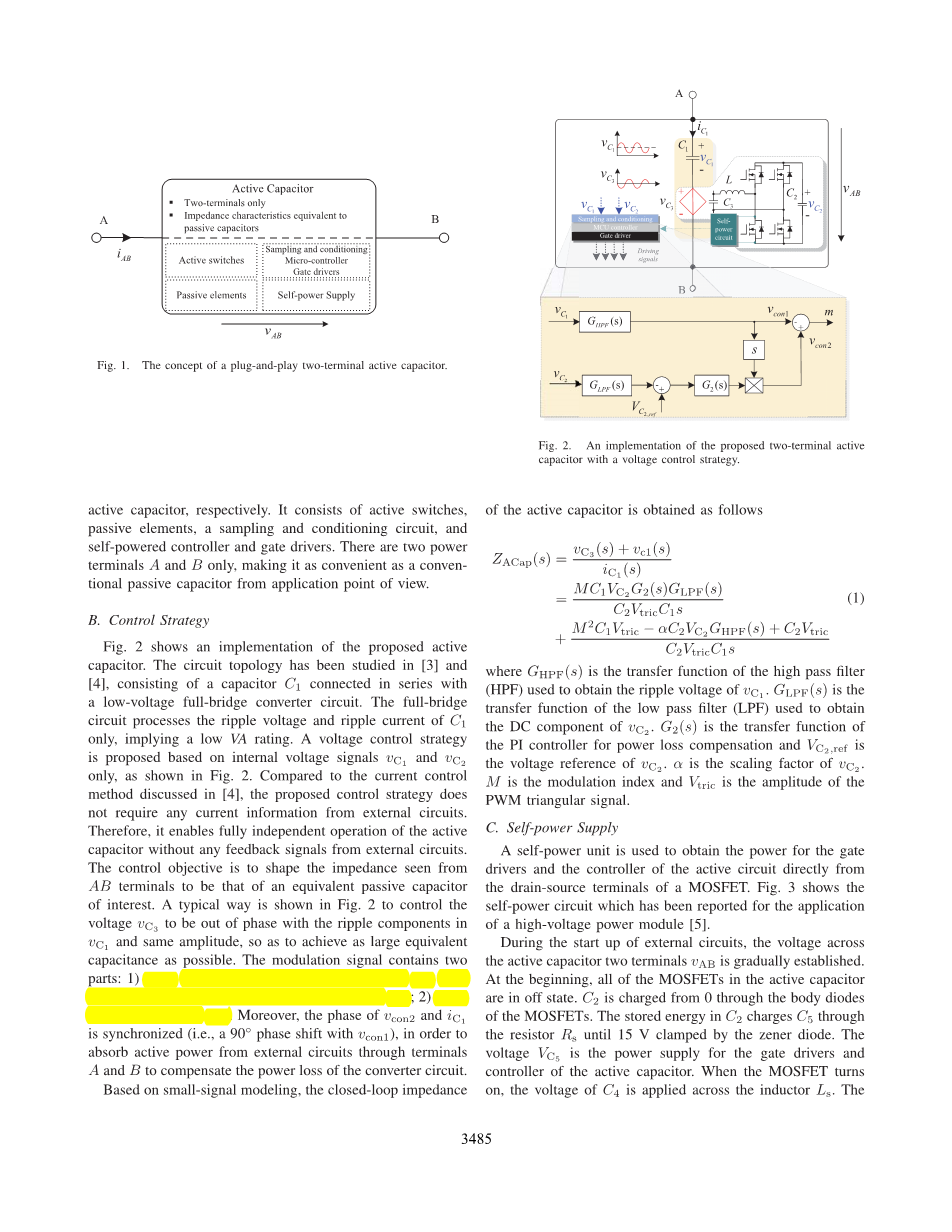 图2中显示了有源电容器的应用方法。电路拓扑在[3]与[4]中进行了研究,使用了仅由串联连接的电容组成的一种低压全桥变换电路。全桥变换电路仅对的纹波电压和纹波电流进行处理,这意味着将会偏低。于是,如图2所示的仅基于内部电压和的电压控制策略被提出。与在[4]中讨论的电流控制方法相比,这种控制策略不需要任何来自外部电路的电流信息。因此,它使有源电容完全独立。而不需要任何外部电路反馈信号。这种控制的目的是使得双端AB的等效阻抗与无源电容器的双端AB阻抗相同。图2使用了一种典型的方法来控制电压,这使得与具有相同的振幅和同相纹波分量,这种方法使有源电容器与无源电容器在阻抗上尽可能相同。调制信号包含两个部分:1)是VC1中提取的纹波分量,则是用于调节转换器来产生所需的;2)是用于稳定。此外,与相位是同步的(即发生90◦相移),这是为了通过端子吸收外部电路的有功功率A和B来补偿变换器电路的功率损耗。