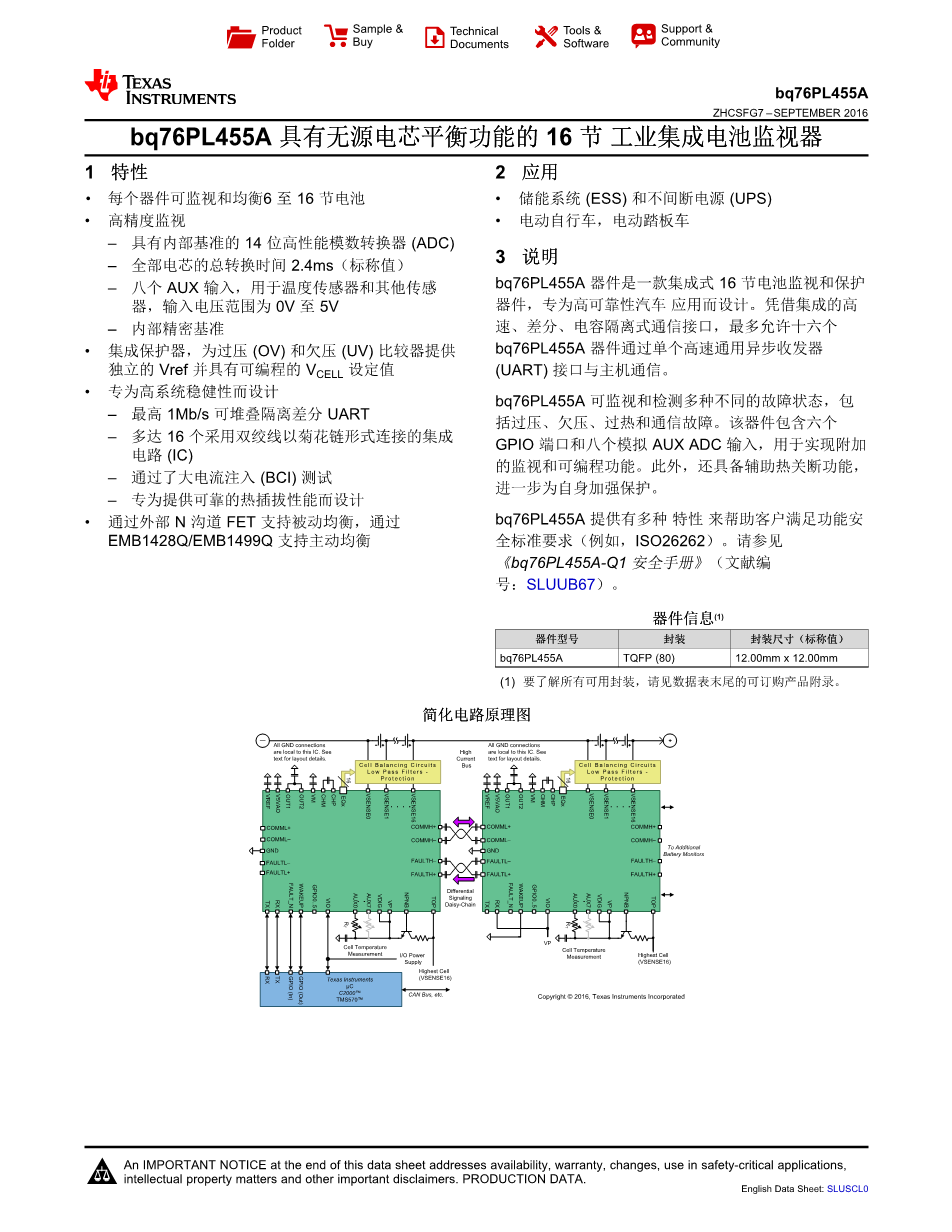 bq76PL455A 具有无源电芯平衡功能的16 节工业集成电池监视器 1