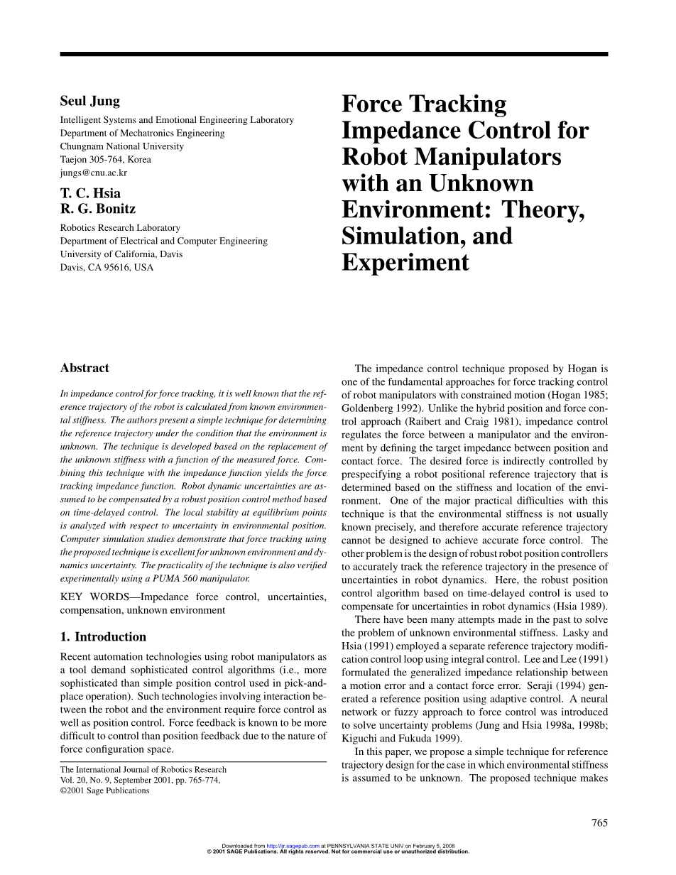 近年来使用机器人作为工具的自动化技术要求复杂的控制算法(即在拾取和放置操作中使用比简单的位置控制算法更复杂)。这种涉及机器人与环境相互作用的技术需要力控制和位置控制。由于力配置空间的性质,力反馈比位置反馈更难控制。Hogan提出的阻抗控制技术是一种力与约束运动的机器人力跟踪控制的基本方法(Hogan 1985;戈登伯格1992)。与混合的位置和力控制方法(Raibert和克雷格1981)的不同之处在于,阻抗控制通过定义位置和接触力之间的目标阻抗来调节机械手和环境之间的力。通过预先确定的基于环境的刚度和位置确定的机器人位置参考轨迹来间接控制期望的力。这种技术的一个主要的实际困难是,环境刚度通常不被精确地知道,因此精确的基准轨迹不能被设计来实现精确的力控制。另一个问题是设计鲁棒机器人位置控制器,以精确跟踪机器人动力学不确定情况下的参考轨迹。在这里,基于时间延迟控制的鲁棒控制算法是用来补偿在机器人动力学的不确定性(Hsia 1989)。