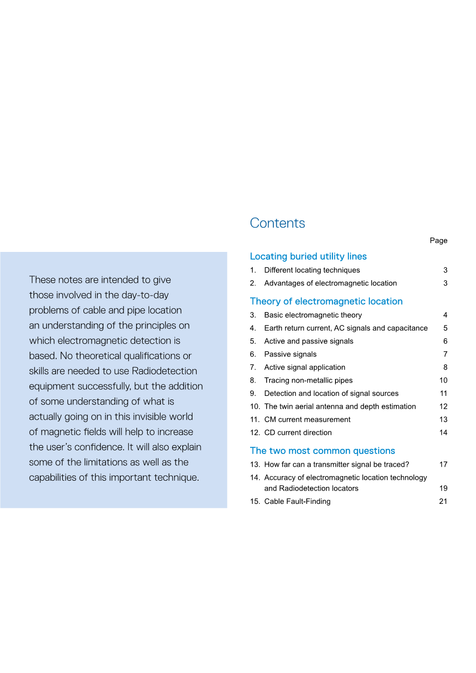 这种针对埋设地下管道、电缆和下水道的方法现已十分普及。它的主要缺点是它不能定位非金属管道,如塑料管。然而,实际操作中用少量的成本来铺设带有示踪电线的塑料管就能避免这个缺点。这项技术有很多优点,因此雷迪公司专注于开发和利用电磁定位技术。