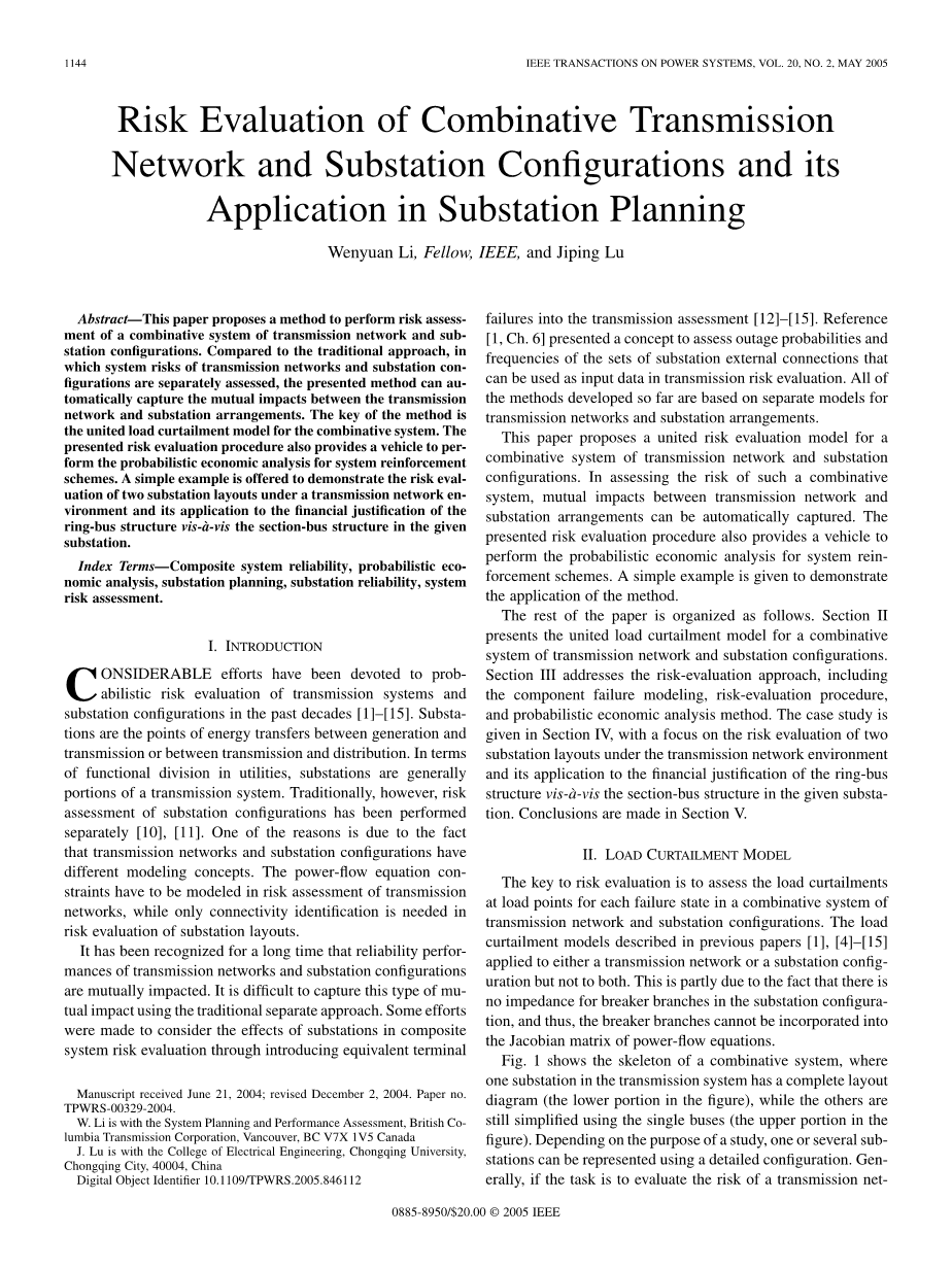 关键词:组合系统可靠性、概率经济分析、变电站规划、变电站可靠性、系统风险评估
