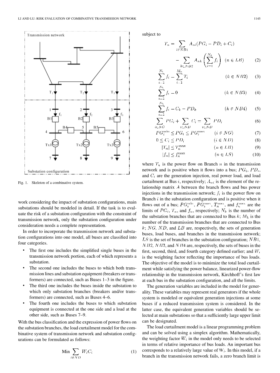 风险评估的关键是在输电网络和变电站配置的组合系统中,评估每个故障状态的负荷曲线。在以前的文献[1, 4-15]中,描述了负荷削减模型应用于输电网络和变电站的配置,但对两者都不适用。这部分原因是在变电站的配置中没有断路器分支的阻抗,因此,断路器分支不能被合并到功率流方程的雅可比矩阵中。