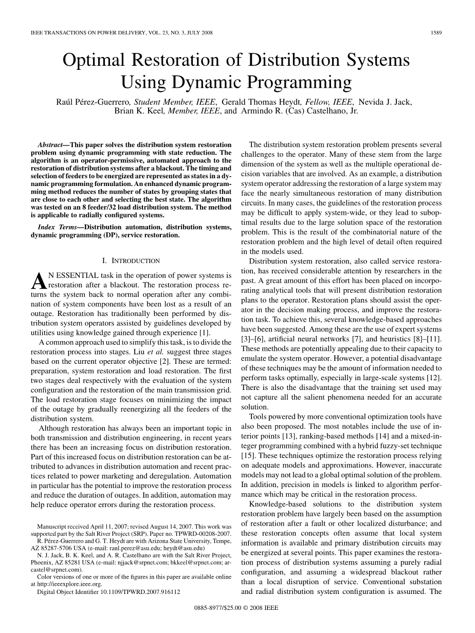 Rauacute;l Peacute;rez-Guerrero, Student Member, IEEE, Gerald Thomas Heydt, Fellow, IEEE, Nevida J. Jack, Brian K. Keel, Member, IEEE, and Armindo R. (Cas) Castelhano, Jr.