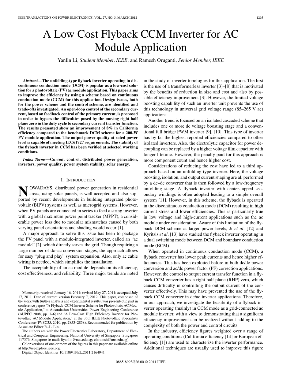 摘要 - 非连续导通模式(DCM)下的展开式反激式逆变器作为光伏(PV)交流模块应用的低成本解决方案而受到欢迎。 本文旨在通过使用基于连续导电模式(CCM)的方案来提高效率。确定电源方案和控制方案的设计问题并对其进行权衡调查。基于初级电流的反馈控制,提出了次级电流的开环控制,以便将占空比中右半平面零点所产生的困难绕过到次级电流传递函数。 结果显示,与基准DCM方案相比,加利福尼亚州效率提高了8%,用于200瓦光伏模块应用。 额定功率水平的输出电能质量能够满足IEC61727的要求。 反激式逆变器在CCM中的稳定性已在选定的工作条件下得到验证。
