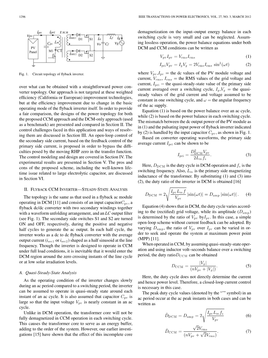 该拓扑结构与在DCM工作的反激式交流模块[11]中使用的相同,并且由一个输入电容器Cpv,一个具有两个次级绕组和一个波形展开装置的反激式直流/直流转换器以及一个LC输出滤波器组成(见图1)。 次级侧开关S1和S2分别在正和负半周期期间接通和断开,以产生交流输出。 在每个半周期中,逆变器作为直流到直流反激式转换器工作,平均输出电流(isec1或isec2)在线路频率处形成半正弦曲线。 尽管逆变器设计为在全负载条件下以连续导通模式工作,但它不可避免地会在线路周期的零交叉点周围或低太阳辐射水平下进入断续导通区域。