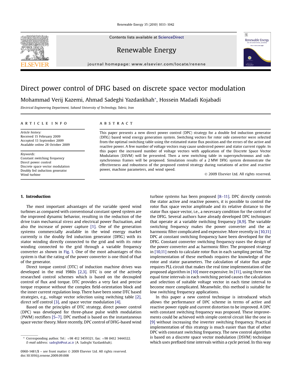 本文提出了一种基于双馈感应发电机(DFIG)的风力发电系统的新型直接功率控制(DPC)策略。 使用估计的定子位置和有功和无功功率的误差,从最优开关表中选择转子侧变换器的开关向量。 少数电压矢量可能会导致不需要的功率和定子电流纹波。 本文将介绍应用离散空间矢量调制(DSVM)的电压矢量的增加数量。 然后在超同步和次同步帧中提出一个新的切换表。2 MW DFIG系统的仿真结果证明了在有功和无功功率,机器参数以及风速变化过程中所提出的控制策略的有效性和鲁棒性。