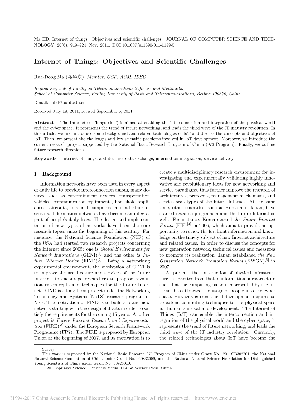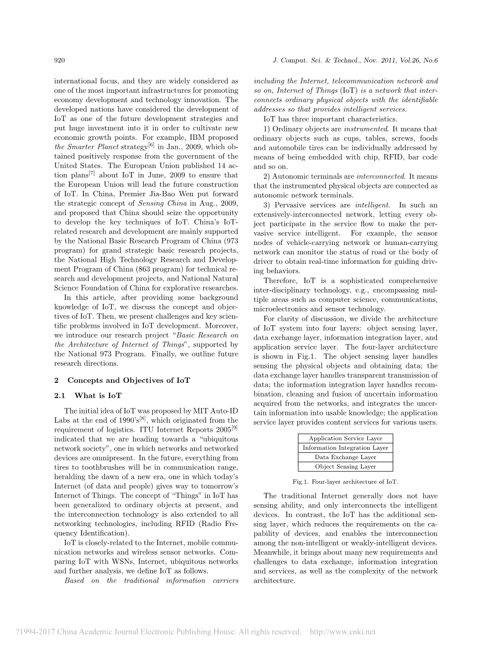 目前,物理基础设施的建设与信息基础设施的建设分离,以互联网为代表的计算模式吸引了人们进入网络空间的使用。 然而,当前的社会发展要求我们将计算技术扩展到人类生存和发展的物理空间。 物联网(IoT)可以实现物理世界和网络空间的互连和整合; 它代表了未来网络的发展趋势,并引领了IT行业革命的第三次浪潮。 目前,有关物联网的相关技术已成为当今的热点国际重点,被广泛认为是促进经济发展和技术创新的最重要的基础设施之一。 发达国家将物联网的发展视为未来发展战略之一,并投入巨资投入培育新的经济增长点。 例如,IBM于2009年1月提出了智慧地球战略,该战略得到了美国政府的积极响应。 欧盟于2009年6月发布了14项有关物联网的行动计划\,以确保欧盟将领导物联网的未来建设。 在中国,温家宝总理在2009年8月提出了感知中国的战略构想,并提出中国应抓住机遇开发物联网关键技术。 中国物联网相关研发主要以国家重大基础研究发展计划(973计划)和国家高技术研究发展计划(863计划)为重点的科技攻关项目,和国家自然科学基金进行探索性研究。 在本文中,在提供了物联网的一些背景知识之后,我们将讨论物联网的概念和目标。 然后,我们提出涉及物联网发展的挑战和关键科学问题。 此外,我们在国家973计划的支持下介绍我们的研究项目“物联网架构基础研究”。最后