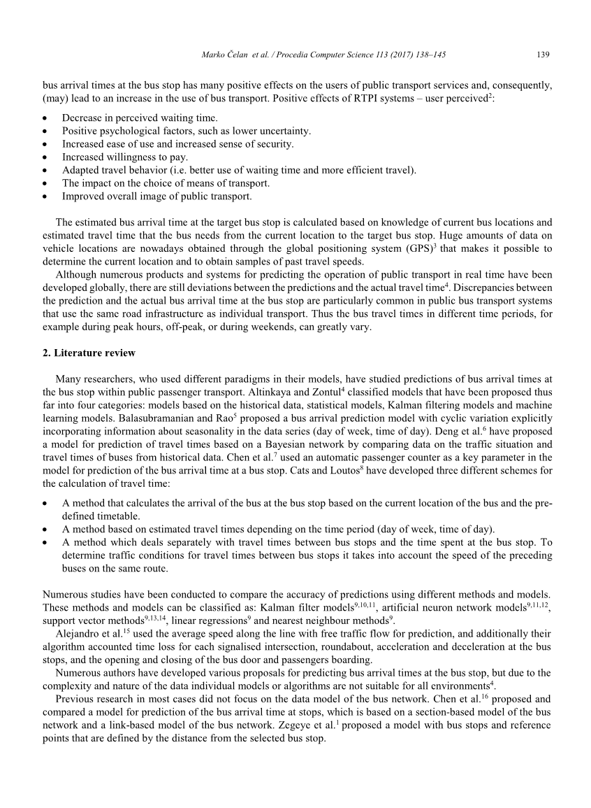 很多在他们的模型中用过不同的案例的研究者们已经对公交系统内的公交到站时间的预测做出了很多研究。 Altinkaya 和Zontul把现在已经有的模型分为了4类:基于历史数据的模型,基于统计数据的模型,卡尔曼滤波模型和机器学习模型。Balasubramanian和Rao提出了一个基于包含季节性数据周期变化的公交车到达时间预测模型。(一周中的每一天,一天中的每一个小时)Deng et al提出了一个基于Bayesian网络模型的公交车到达时间预测的模型,这个模型比较了公交车在特定交通情景和交通时间下的行驶数据和历史数据。Chen et al使用了一个乘客自动计数系统作为预测公交车到达时间的关键数据。Cats and Loutos提出了计算行驶时间的三种机制: