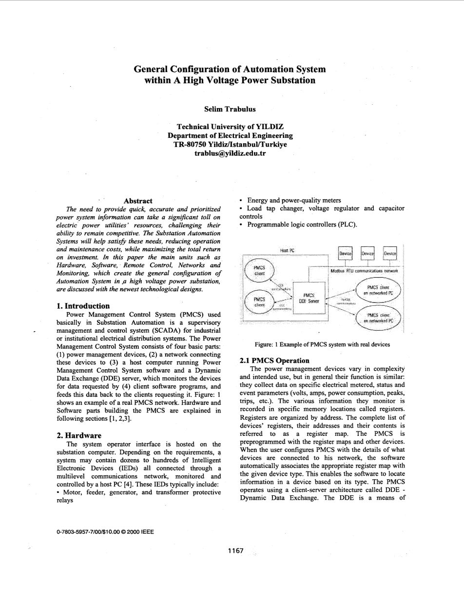 变电站自动化基本上使用的电源管理控制系统(PMCS)是用于工业或机构配电系统的监督管理和控制系统(SCADA)。 电源管理控制系统包括四个基本部分:(1)电源管理设备,(2)将这些设备连接到(3)运行电源管理控制系统软件的主机和动态数据交换(DDE)服务器的网络,其中 监视(4)客户端软件程序所请求的数据的设备,并将该数据反馈给请求它的客户端。 图1显示了一个真正的PMCS网络的例子。 构建PMCS的硬件和软件部分在下面的章节[1,2,3]中进行解释。