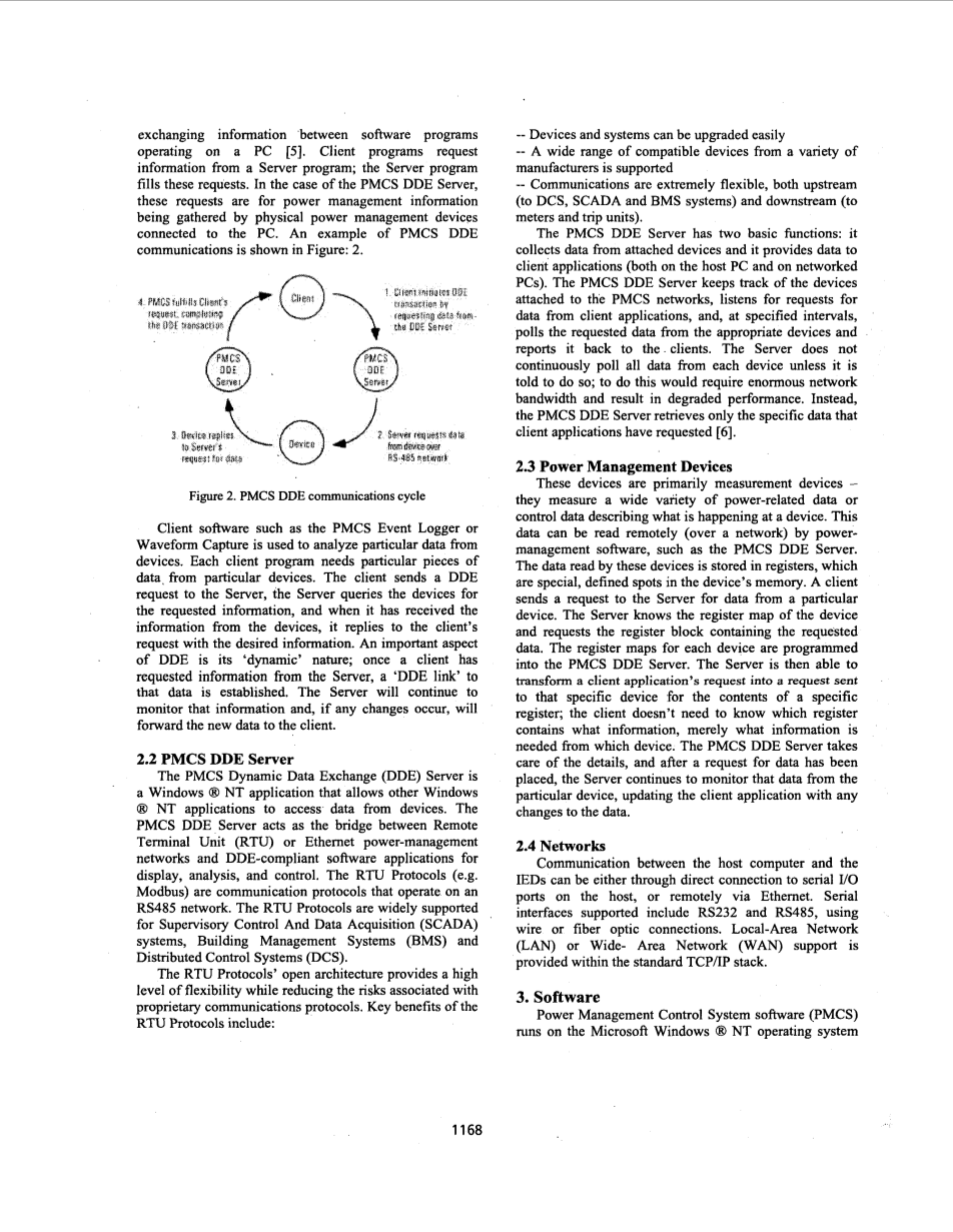 设备连接到他的网络,软件会自动将适当的寄存器映射关联给定的设备类型。这使软件能够根据设备的类型定位设备中的信息。 PMCS使用称为DDE - 动态数据交换的客户端 - 服务器架构进行操作。 DDE是在PC上运行的软件程序之间交换信息的手段[5]。客户端程序从服务器程序请求信息;服务器程序填充这些请求。对于PMCS DDE服务器,这些请求用于通过连接到PC的物理电源管理设备收集电源管理信息。图2显示了PMCS DDE通信的一个例子。