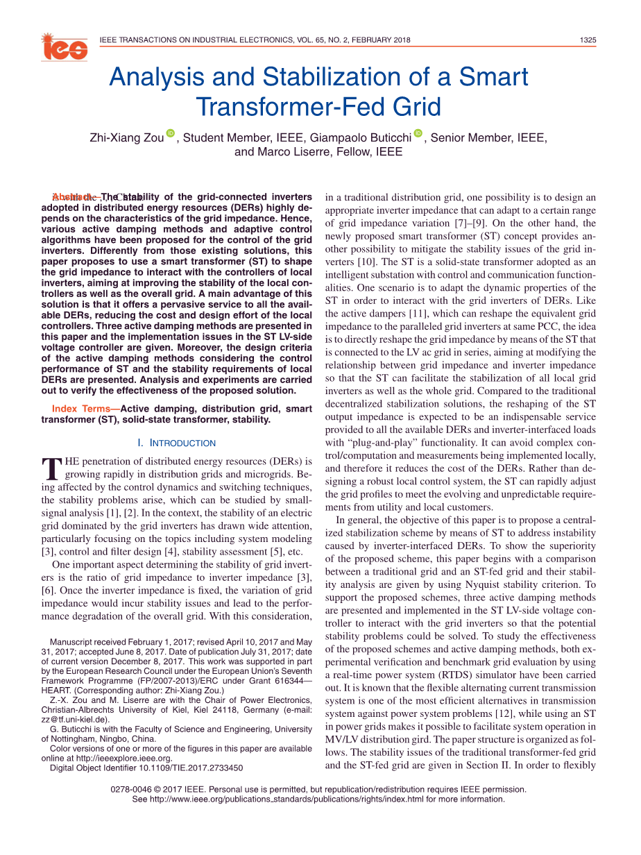 索引术语——主动阻尼,配电网,智能变压器(ST),固态变压器,稳定性。