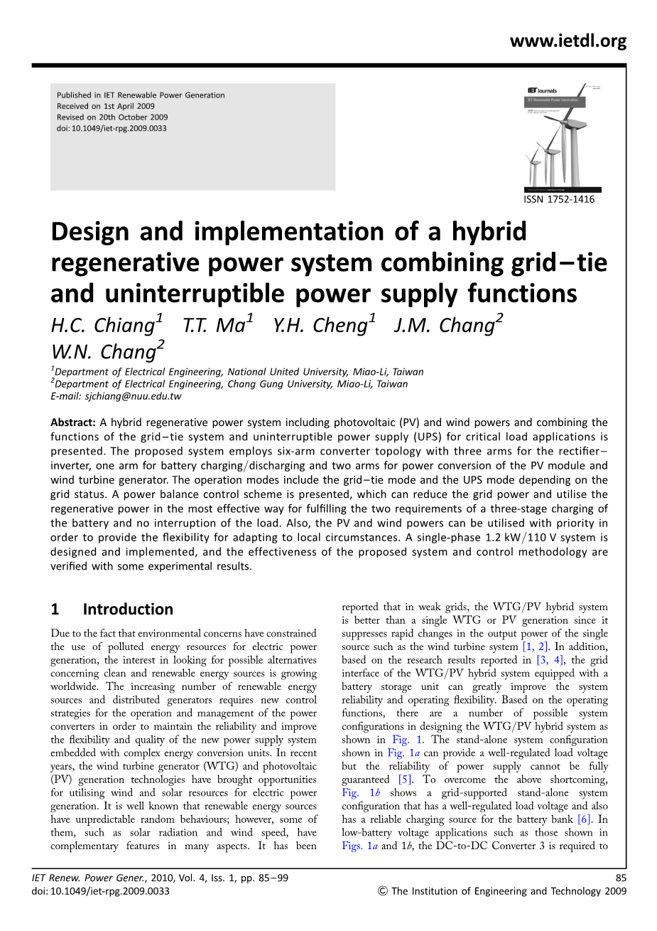 本文介绍了包括光伏(PV)和风力发电的混合再生电力系统,并将电网系统和不间断电源(UPS)的功能组合用于关键负载应用。所提出的系统采用六桥臂转换器拓扑结构,其具有用于整流器 - 逆变器的三个桥臂,用于电池充电/放电的一个桥臂以及用于PV模块和风力涡轮发电机的功率转换的两个桥臂。根据电网的状态,运行模式包括并网模式和UPS模式,提出一种功率平衡控制方案,该方案能够以最有效的方式降低电网功率并利用再生功率来满足电池三阶段充电的两个要求,并且不中断负载。此外,PV和风力可以优先使用,以提供适应当地情况的灵活性。设计并实现了单相1.2kW/110V系统,并通过一些实验结果验证了所提出的系统和控制方法的有效性。