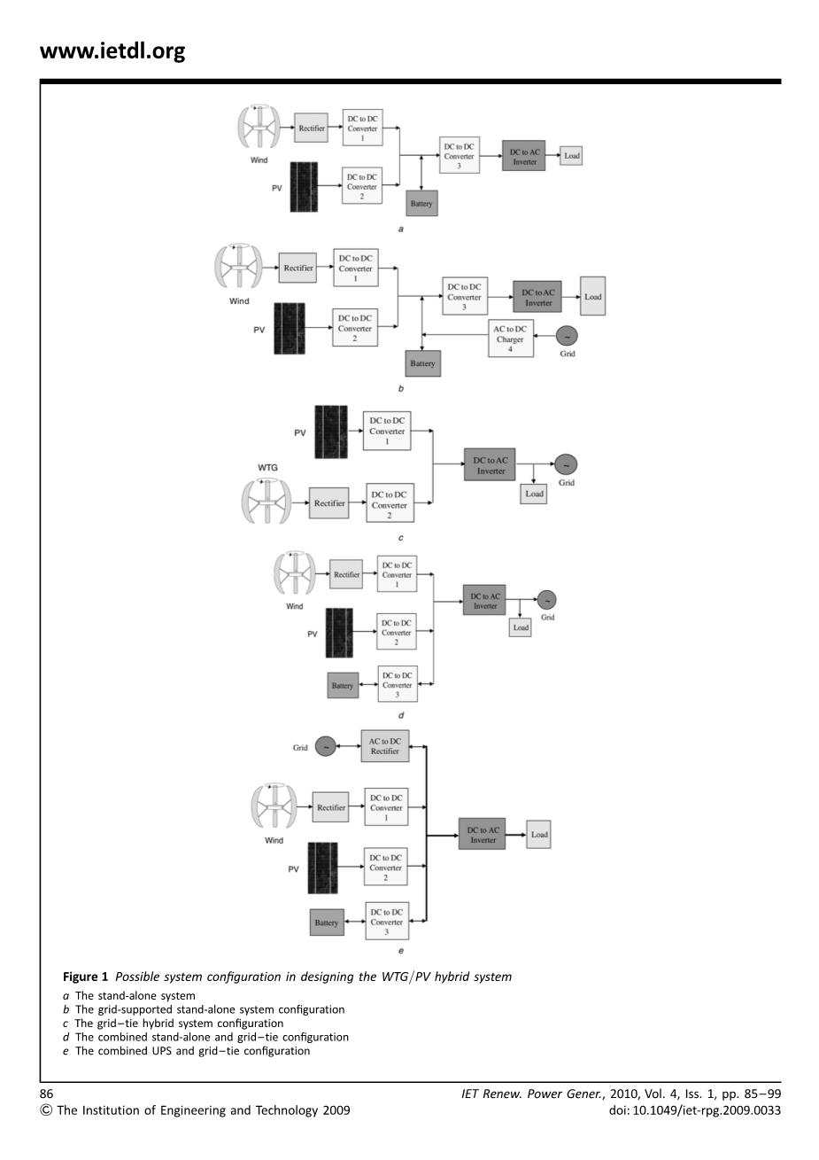 由于环境问题限制了发电用污染能源的使用,因此寻找可能的清洁和可再生能源替代品的需求正在全球范围内持续增长。越来越多的可再生能源和分布式发电机需要新的控制策略来运行和管理电力转换器,以保持可靠性并提高嵌入复杂能量转换单元的新电源系统的灵活性和质量。近年来,风力发电机(WTG)和光伏(PV)发电技术为利用风能和太阳能资源发电提供了机会。众所周知,可再生能源具有不可预知的随机行为;然而,其中的一些,如太阳能和风能,在很多方面都具有互补性。据报道,在弱电网中,风力发电机组/光伏混合系统比单个风力发电机组或光伏发电系统更好,因为它抑制了风力发电机组等单一输出功率的快速变化[1,2]。 另外,根据[3,4]报道的研究结果,配备电池存储单元的WTG / PV混合动力系统的电网接口可以极大地提高系统运行的可靠性和灵活性。基于操作功能,在设计如图1所示的风力发电机组/光伏混合动力系统时,有许多可能的系统配置。图1a所示的独立系统配置可以提供稳定的负载电压,但电源的可靠性不能得到充分的保证[5]。为了克服上述缺点,图1b显示了一个电网支持的独立的系统配置,具有良好的负载电压调节,并且有用于电池组的可靠充电源[6]。在低电池电压应用中,例如图1和2所示的应用。在图1a和1b中,DC-DC转换器3需要将电压升高到足以用于后级DC-AC逆变器的水平; 否则这个阶段可以省略。图1c [7]显示了一个并网混合系统,允许从WTG和PV向电网注入额外功率。在某些设计案例中,独立式和并网式配置如图1d所示,以实现更好的操作灵活性[8,9]。 应该注意的是,这两种配置中的负载电压不受调节,并且随着电网电压而浮动。 因此,对于关键负载应用,必须使用图1e [10]所示的组合在线不间断电源(UPS)的配置。 尽管Burgio等人 [10]显示了系统的操作和可靠性,详细的转换器电路,控制算法和系统的电源管理至今未见报道。在本文中,我们提出了一种用于UPS整流器逆变器的三桥六臂转换器拓扑结构,以及用于PV,WTG和电池的三桥臂,用于结合在线UPS和并网再生电力系统。 提出了一种新型的功率平衡控制方案。其设计目的是为了降低电网功率并以最有效的方式利用可再生能源,并且最重要的是满足电池三级充电的高充电状态和不中断的高负载可靠性。此外,可以优先对光伏和风力发电的利用进行设计。此功能对于适应天气变化和当地环境非常重要,可以提高系统的灵活性和性能。提供了转换器的详细建模和控制器设计。设计并实现了一个单相1.2 kW / 110 V系统,并通过一些实验结果验证了所提出的系统和控制方法的有效性。