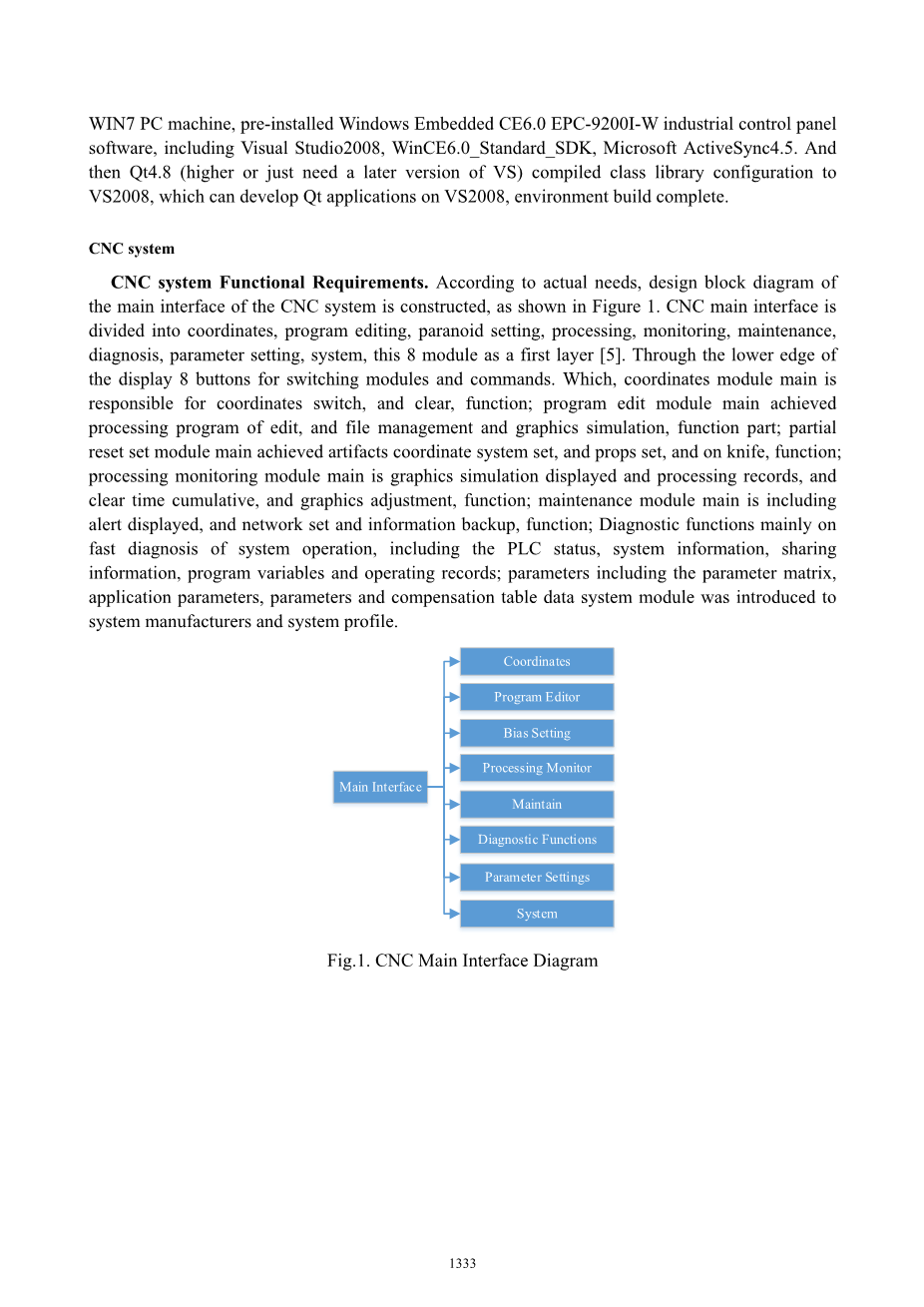 基于WinCE开发需求的数控系统需要拥有基于WinCE系统的PC开发环境,即构建“VS Qt SDK”开发环境。具体的开发环境如下:硬件包括安装WIN7 PC机,预装Windows Embedded CE6.0 EPC-9200I-W工业控制面板软件,包括Visual Studio2008,WinCE6.0_Standard_SDK,Microsoft ActiveSync4.5。然后Qt4.8(更高版本或者只是需要更高版本的VS)配置VS2008编译好的类库,使得开发者可以在VS2008上开发Qt应用程序。环境搭建完成。