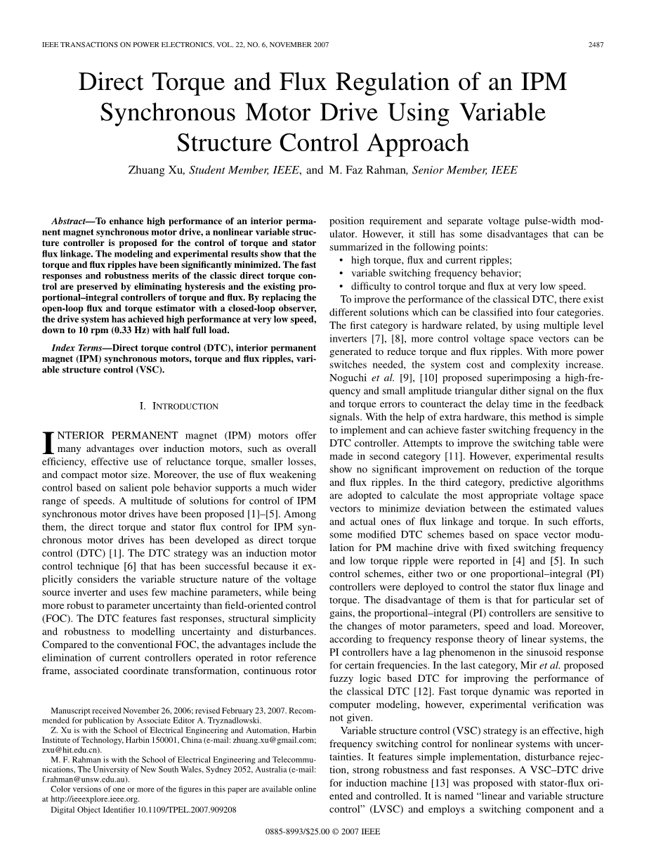 关键词 - 直接转矩控制(DTC),内置永磁(IPM)同步电机,转矩和磁链脉动,变结构控制(VSC)。