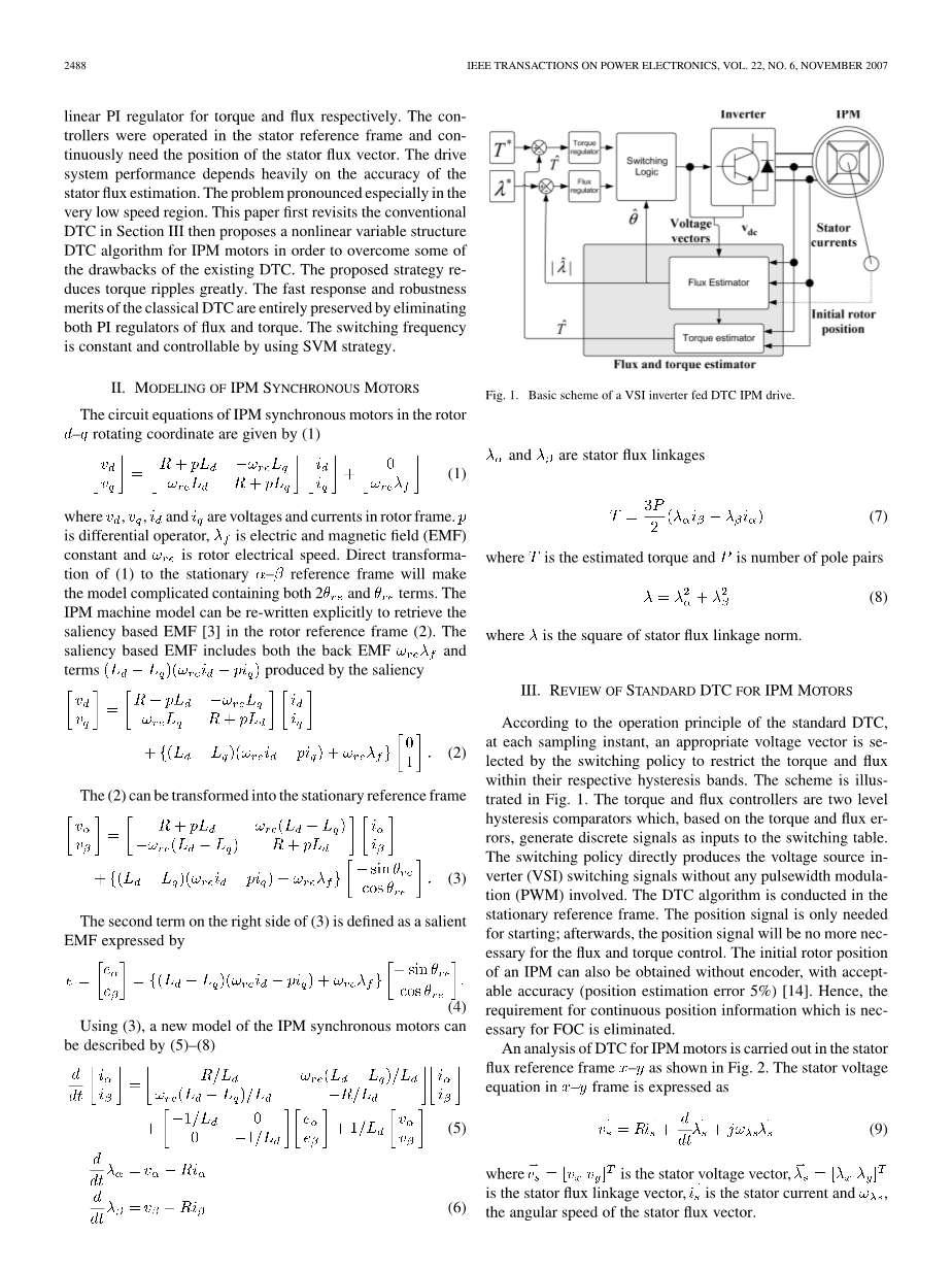 与IPM电机的标准DTC相关的问题是定子磁通估算中的误差,低速性能差,转矩和磁通的高波动,可变开关频率特性以及缺乏完整的稳定性分析和设计工具。 在标准的DTC [1]和随后的改进的驱动系统[5]中,定子磁链通过积分定子感应电压