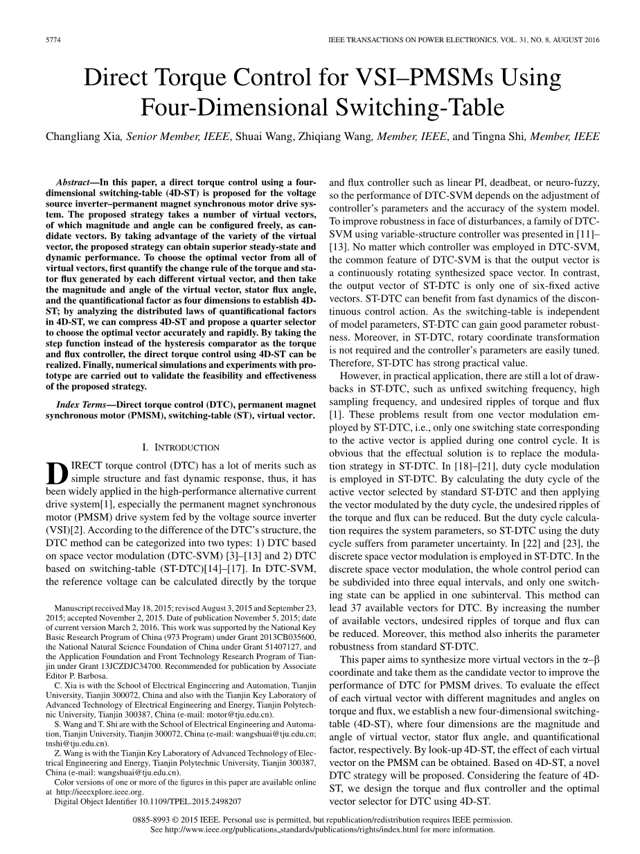 关键词 - 直接转矩控制(DTC),永磁体同步电机(PMSM),开关表(ST),虚拟矢量。