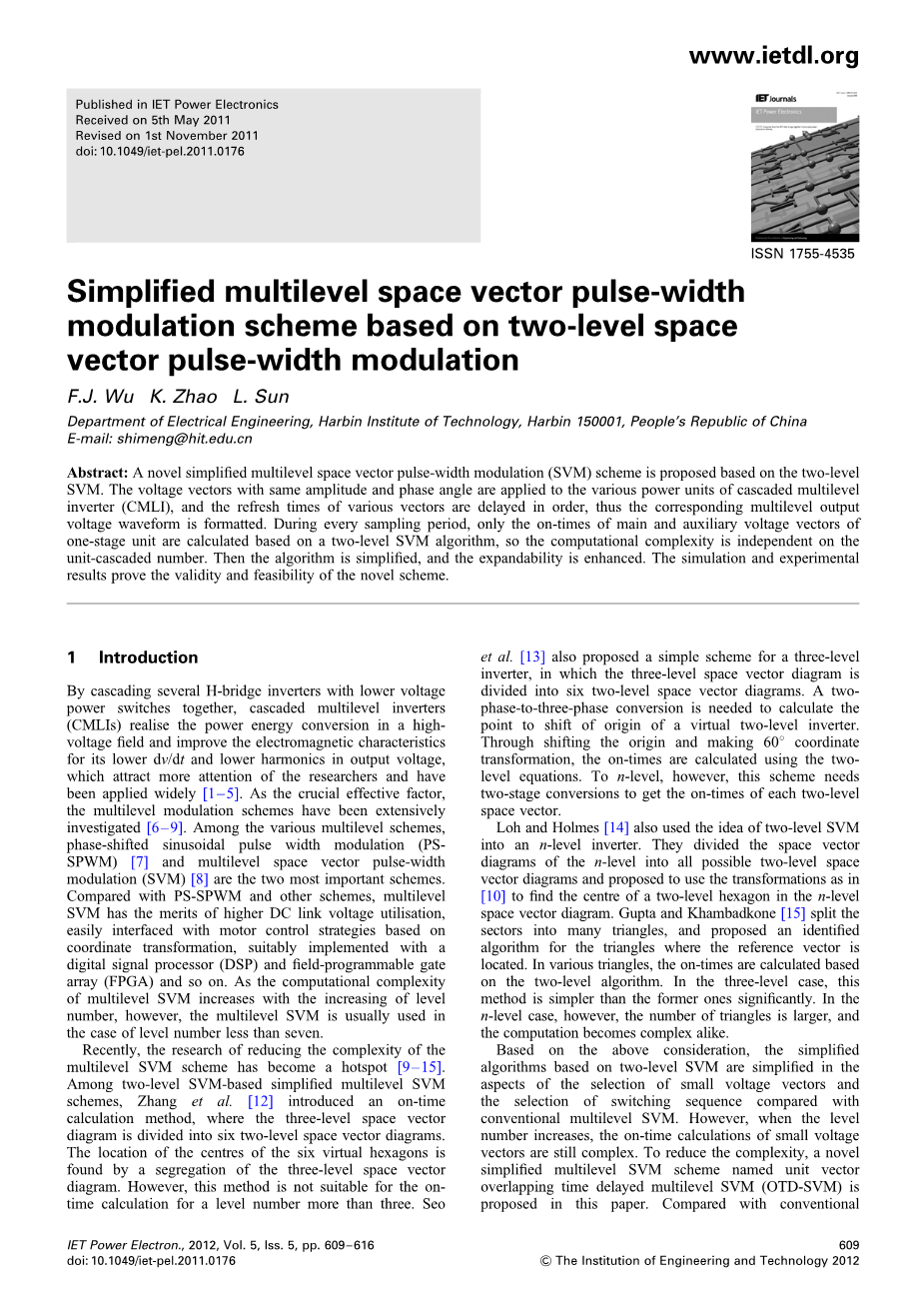 Loh和Holmes也将两级SVM的思想应用到n级逆变器中。 他们将n级的空间矢量图划分为所有可能的两级空间矢量图,并提出将变换用于在n级中找到两级六边形的中心空间矢量图。Gupta和Khambadkone将扇区分成许多三角形,并提出了参考矢量所在三角形的一个识别算法。 在各种三角形中,导通时间是基于两级算法计算的。 在三级案例中,这种方法比前者更为简单。 然而在n级案例中,三角形的数量较多,并且计算变得相当复杂。