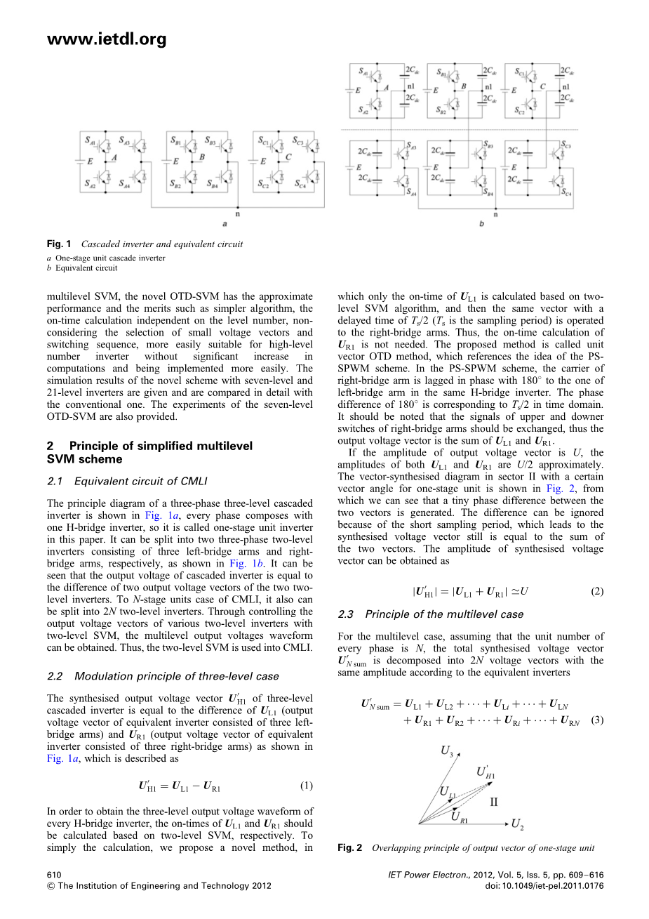 Uh1三电平合成输出电压矢量级联逆变器等于总输出的Ul1(输出等效逆变器的电压矢量由三个左侧桥臂)和LRI(等效输出电压矢量)逆变器由三个右桥臂组成),如图1a所示,它被描述为