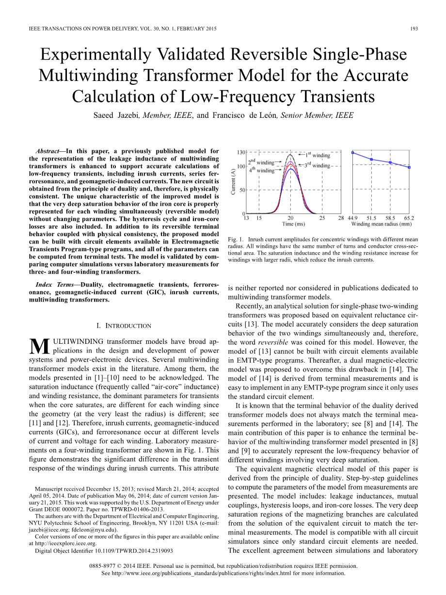 最近,基于等效磁阻电路[13]提出了单相双绕组变压器的分析解决方案。 该模型准确地考虑了两个绕组的深饱和行为,因此,该模型创造了可逆字。 然而,[13]的模型不能用EMTP型程序中的电路元件构建。 此后,提出了一个双磁电模型来克服这个缺点[14]。 [14]的模型来源于终端测量,并且易于在任何EMTP类型的程序中实现,因为它只使用标准电路元件。