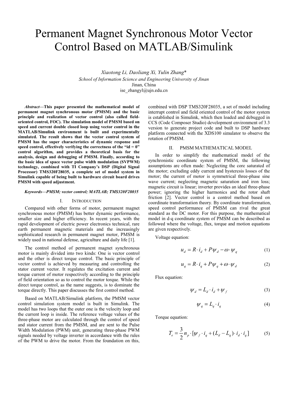 ise_zhangyl@ujn.edu.cn摘要 - 介绍了永磁同步电机(PMSM)的数学模型和矢量控制(也称为磁场定向控制,FOC)的基本原理和实现。建立了基于速度和电流双闭环矢量控制的MATLAB / Simulink环境下永磁同步电动机仿真模型,并进行了实验仿真。结果表明,永磁同步电动机矢量控制系统具有动态响应和速度控制的超强特性,有效验证了“id = 0”控制算法的正确性,为永磁同步电动机的分析,设计和调试提供了理论依据。最后,根据空间矢量脉宽调制(SVPWM)技术的基本思想,结合TI公司的DSP(数字信号处理器)TMS320F28035,构建了一套完整的pmsm调速系统。