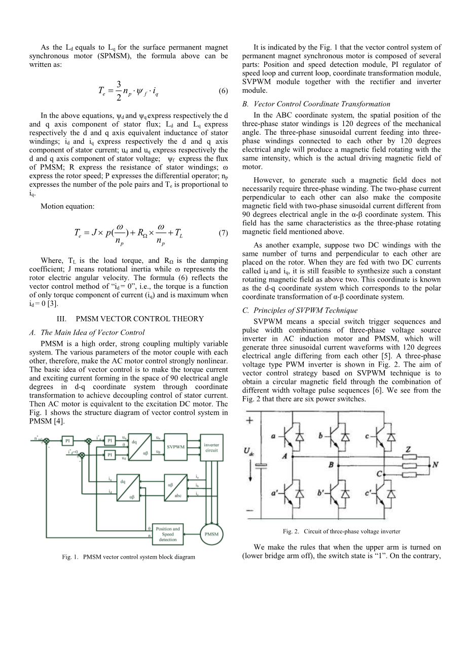 其中,是负载转矩,是阻尼系数; J表示转动惯量,而omega;表示转子电角速度。公式(6)反映了“= 0”的矢量控制方法,即转矩仅为电流转矩分量()的函数,当= 0时, 3]。