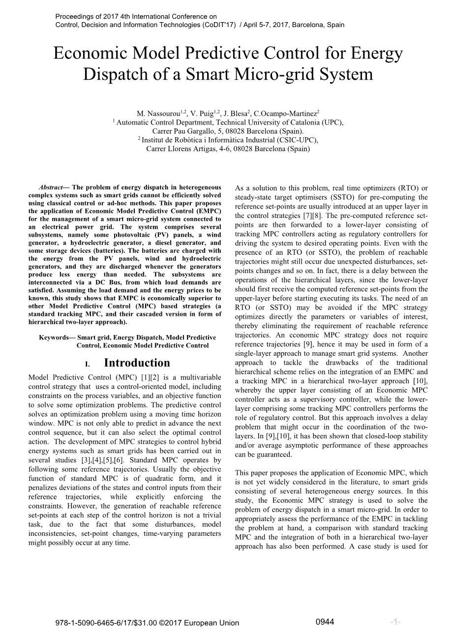 EMPC策略的主要目标是最大限度地降低生产和分配成本,并确保能源可用性的同时随时满足负载需求。 为了实现这些目标,已经考虑了三个操作目标:经济性,安全性和平稳性。 事实上,这些操作目标已经在[8]中使用,其中巴塞罗那的配水管网管理问题得到了处理。 在这项研究中,我们正在将它们用于电气智能电网的管理。 经济MPC使用MPC原则而不指定参考轨迹。 但是,应该注意的是,EMPC可能会引入[8]中提到的可行性损失。