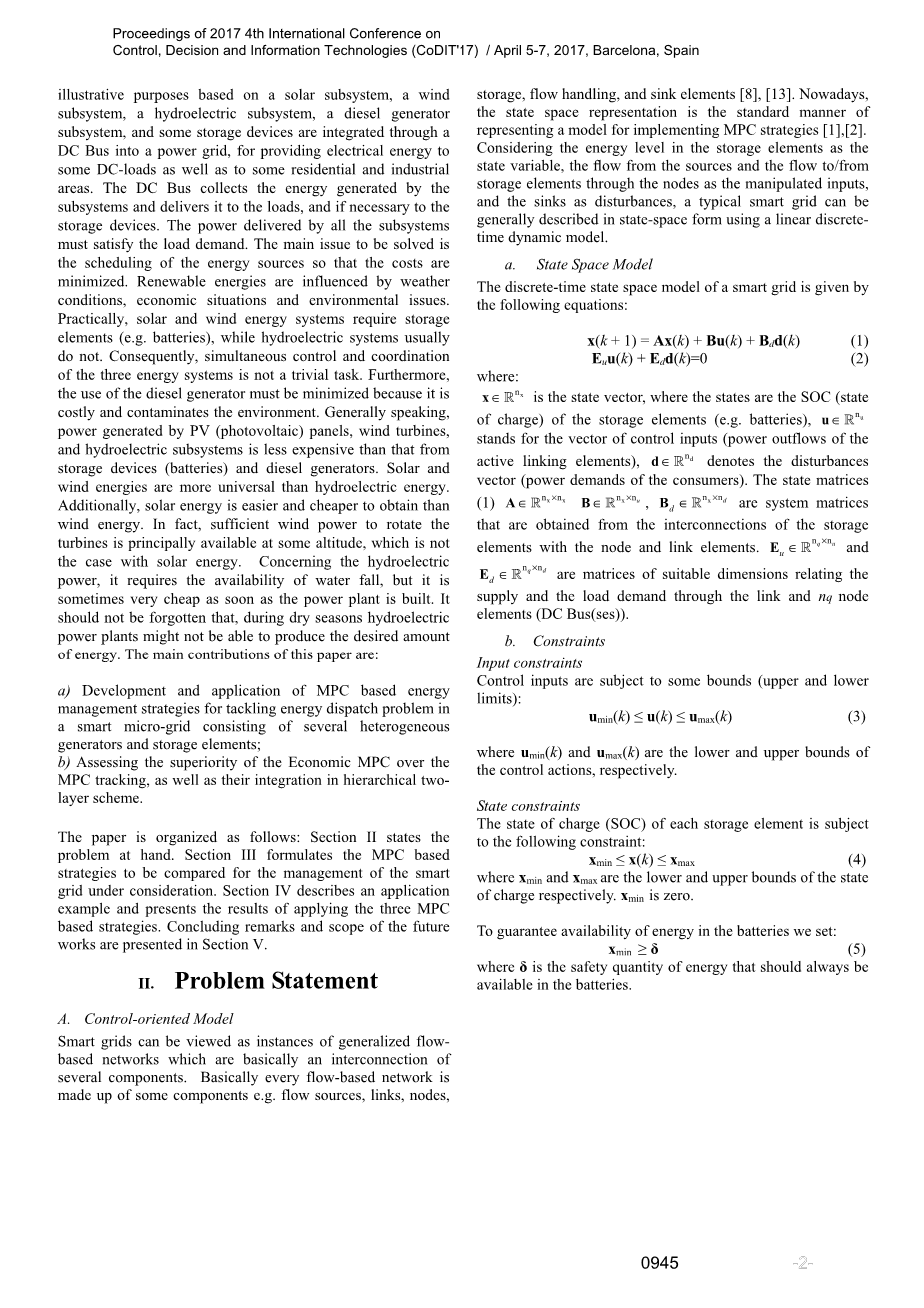 本文思路如下:第二节阐述了手头的问题。 第三节提出了基于MPC的策略,以便对所考虑的智能电网进行管理。 第四节描述了一个应用实例,并介绍了应用三种基于MPC策略的结果。 第五节介绍了未来工作的结论和范围。