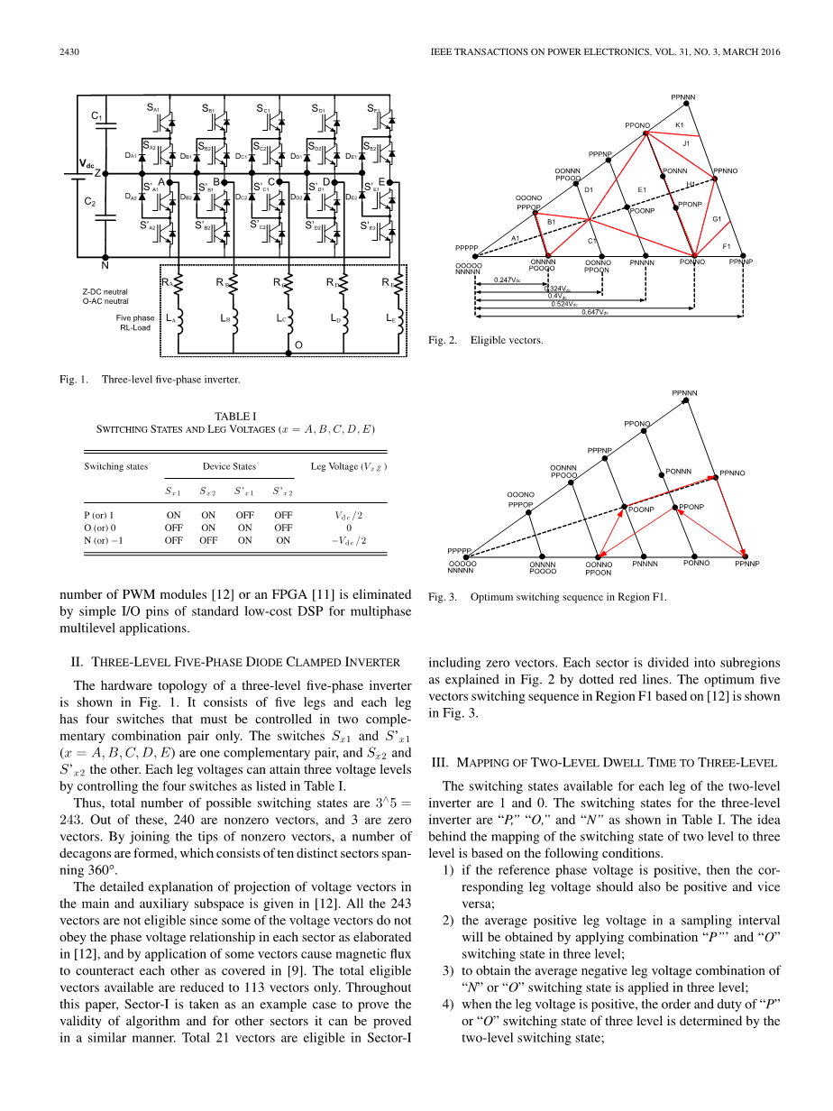 两电平逆变器的每一条引脚可用的开关状态分别为1和0。三电平逆变器的开关状态为“p”、“o”和“n”,如表I所示。两电平到三电平的开关状态映射背后的思想是基于以下条件的。