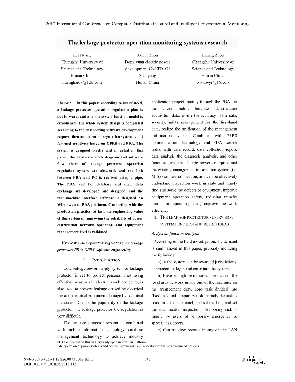 关键词:操作规程 漏电保护器 PDA GPRS 软件工程