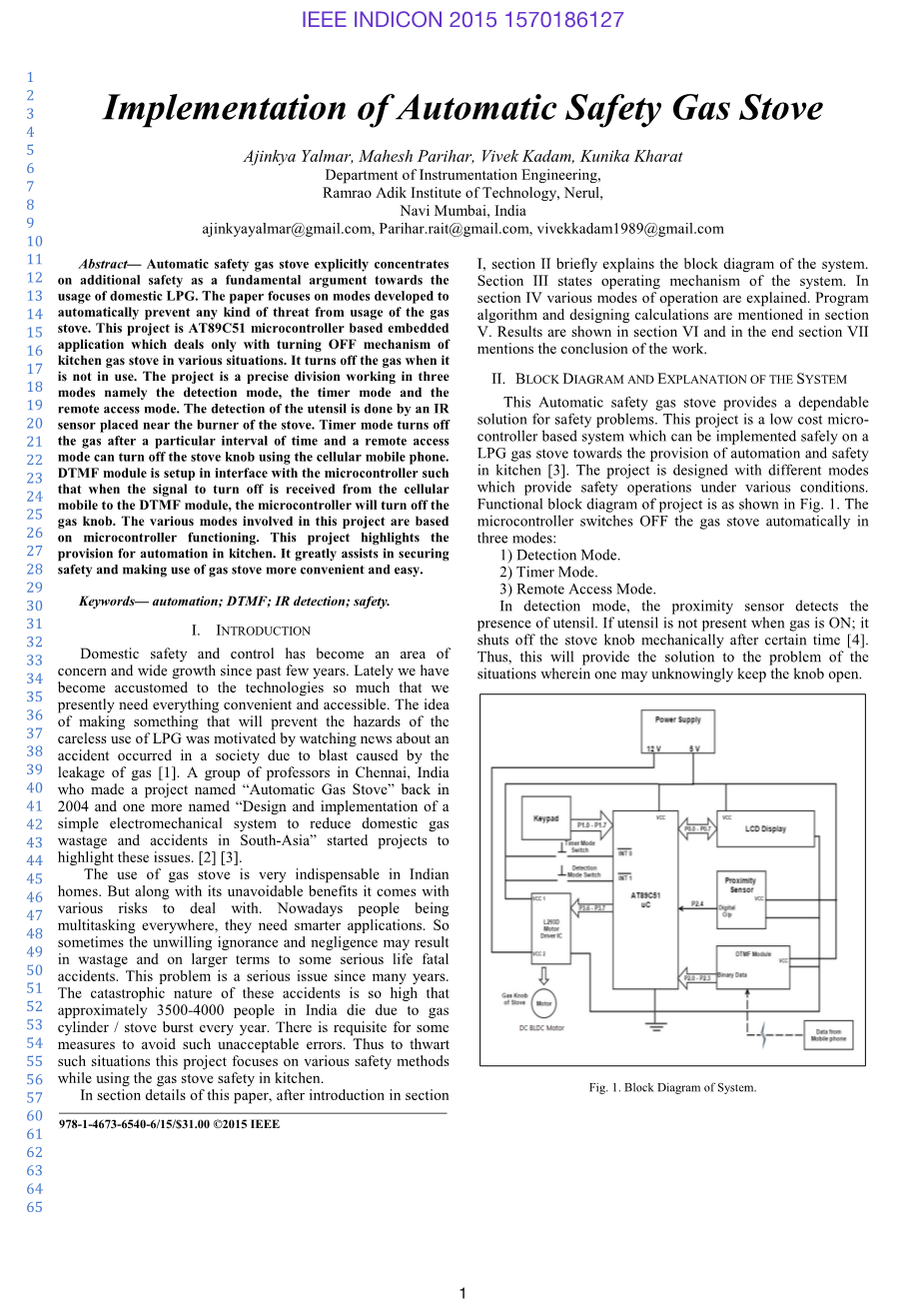 国内安全控制已成为近几年来令人关注和广泛增长的领域。最近,我们已经习惯了这么多的技术,我们目前需要一切方便和方便。制造一些能够防止不小心使用LPG的危险的想法是通过观察由于气体泄漏而引起的爆炸事件在社会中发生的事故的动机。印度钦奈的一些教授在2004年又创办了一个名为“自动燃气炉”的项目,还有一个名为“设计和实施简单机电系统以减少南亚国内气体浪费和事故”的项目这些问题。燃气灶的使用在印度家庭中是非常不可或缺的。但随着其不可避免的好处,它带来各种风险来处理。现在人们在处理多任务时,他们需要更聪明的应用程序。因此,有时候不愿意的无知和疏忽可能导致浪费,并导致一些严重的生命致命事故。这个问题是多年来的一个严重问题。这些事故的灾难性性质如此之高,使印度约3500-4000人每年因气瓶/火炉爆炸而死亡。有必要采取一些措施来避免这种不可接受的错误。因此,为了阻止这种情况,本项目关注于在厨房中使用燃气灶安全的各种安全方法。在本文中的部分细节,出台后第一节,第二节简要介绍了该系统的框图。第三节说明系统的运行机制。在第IV节中解释了各种操作模式。程序算法和设计计算中提到的第五节。结果显示在第六节,最后一节提到工作的结论。