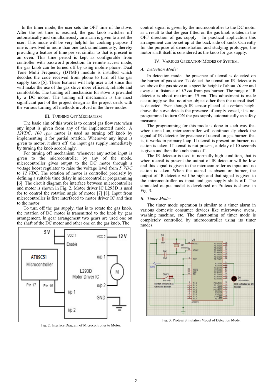 在定时器模式下,用户设置炉子的关闭时间。达到设定的时间后,气体旋钮自动关闭,同时发出警报提醒用户。如果同时涉及多于一个任务,这种模式将非常有助于烹饪目的,从而提供类似于在烤箱中存在的时间预设置的特征。该时间段由具有密码保护的控制器保持可配置。在远程访问模式下,可以通过使用手机关闭气体旋钮。安装双音多频(DTMF)模块,对从电话接收的代码进行解码以关闭气体供应旋钮。这些功能将帮助用户很多,因为这将使使用燃气灶更高效,可靠和舒适。炉子的关闭机构由直流电动机提供。关闭机制是项目设计中最重要的部分,因为项目涉及三种模式中涉及的各种关闭方法。