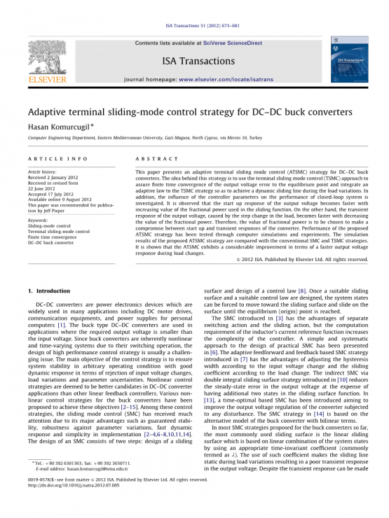 本文提出一种自适应终端滑模控制(ATSMC)战略DC-DC转换器。 这种策略背后的想法是使用终端滑模控制(台积电)方法以确保输出电压误差的有限时间收敛到平衡点和集成的自适应律台积电策略,实现动态滑线在负载变化。 此外,控制器的影响参数对闭环系统的性能研究。 这是观察到的启动响应输出电压变得更快增值的部分权力使用的滑动功能。 另一方面,输出电压的瞬态响应,在负载阶跃变化造成的,变得更快,减少部分的价值力量。 因此,部分权力的价值选择启动之间做出妥协和瞬态响应的转换器。 的性能提出ATSMC策略是通过计算机模拟和实验测试。 拟议中的ATSMC策略的仿真结果比较与传统SMC和台积电策略。 这表明ATSMC展览一个巨大进步的更快的输出电压响应在负载变化。