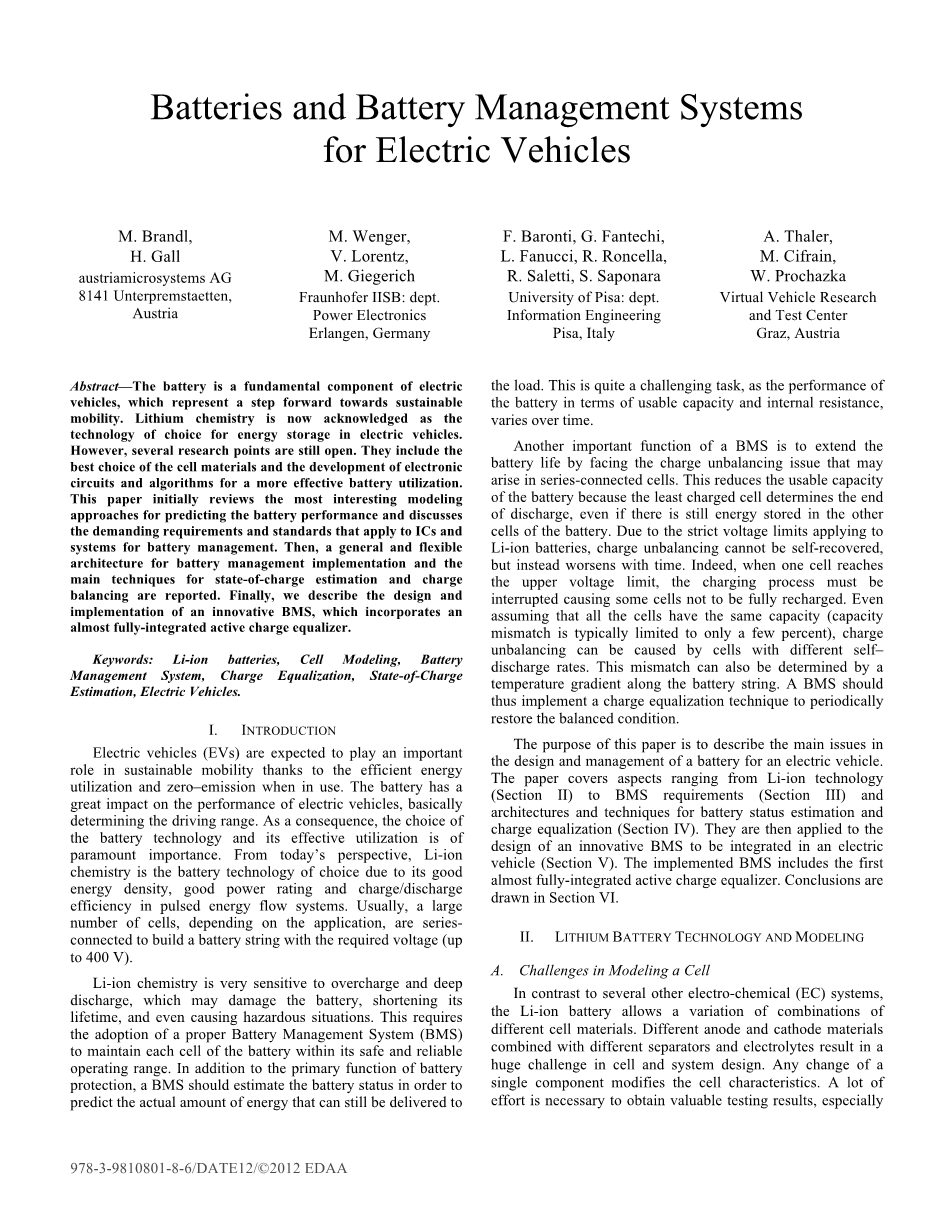 电池是电动汽车的基本组成部分,代表着可持续移动的一步。锂化学现在被公认为电动汽车储能的首选技术。但是,仍有几个研究点尚未公开。它们包括电池材料的最佳选择以及电子电路和算法的开发,以实现更有效的电池利用率。本文最初回顾了用于预测电池性能的最有趣的建模方法,并讨论了适用于电池管理的IC和系统的苛刻要求和标准。然后,报告了用于电池管理实现的通用且灵活的架构以及用于充电状态估计和电荷平衡的主要技术。最后,我们描述了创新BMS的设计和实现,其中包含几乎完全集成的有源电荷均衡器。