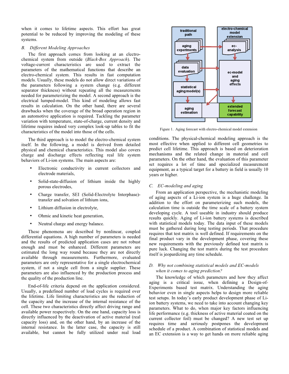 这些现象由非线性耦合微分方程描述。需要大量参数,预测应用案例的结果不够稳健,必须加强。长距离估计不同的参数,因为它们不能通过测量直接获得。此外,评估的参数仅代表单个电化学系统,如果不是来自单个供应商的单个电池。这些参数也受生产过程和生产线质量的影响。寿命终止标准取决于所考虑的应用。通常,在整个生命周期内需要预定义数量的负载循环。寿命限制特性是电池容量的降低和电池内阻的增加。这两个特性分别直接影响行驶里程和可用功率。一方面,容量损失直接受到活性材料的失活(实际容量损失)的影响,另一方面,通过内阻的增加。在后一种情况下,容量仍然可用,但在实际负载条件下不能充分利用。当应用于不同的细胞几何形状以预测细胞寿命时,物理 - 化学建模方法是最有效的。该方法基于劣化机制以及材料和电池参数的相关变化。另一方面,该参数组的评估需要大量时间和专门的测量设备,因为现场电池的典型目标通常是10年或更高。