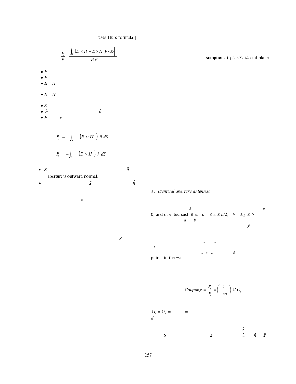 Hu公式是有用的,因为它从两个天线的发射特性中推导出任意一个天线接收的功率P,而不需要明确地要求它们的接收特性。r这是耦合分析的关键,因为CEM软件包能够使用孔径照明来建模天线作为发射机;然而,他们却无法将他们塑造成接受者。Hu方法基于互反定理,形式上是精确的。