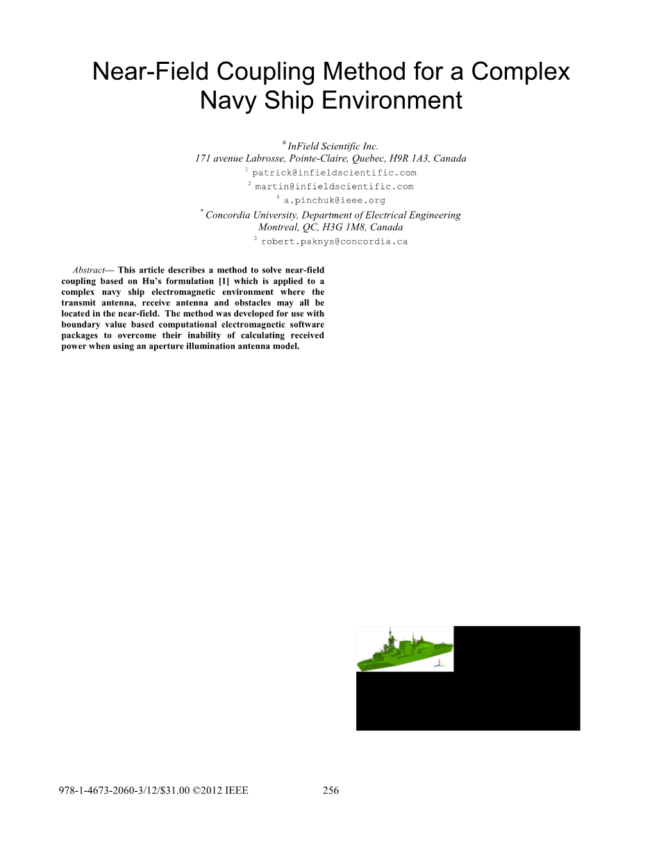 本文介绍了一种基于Hu公式[1]求解近场耦合的方法,并将其应用于复杂的海军舰艇电磁环境中,发射天线、接收天线和障碍物都可能位于近场中。该方法适用于基于边界值的计算电磁软件包,克服了在使用孔径照明天线模型时无法计算接收功率的缺点。