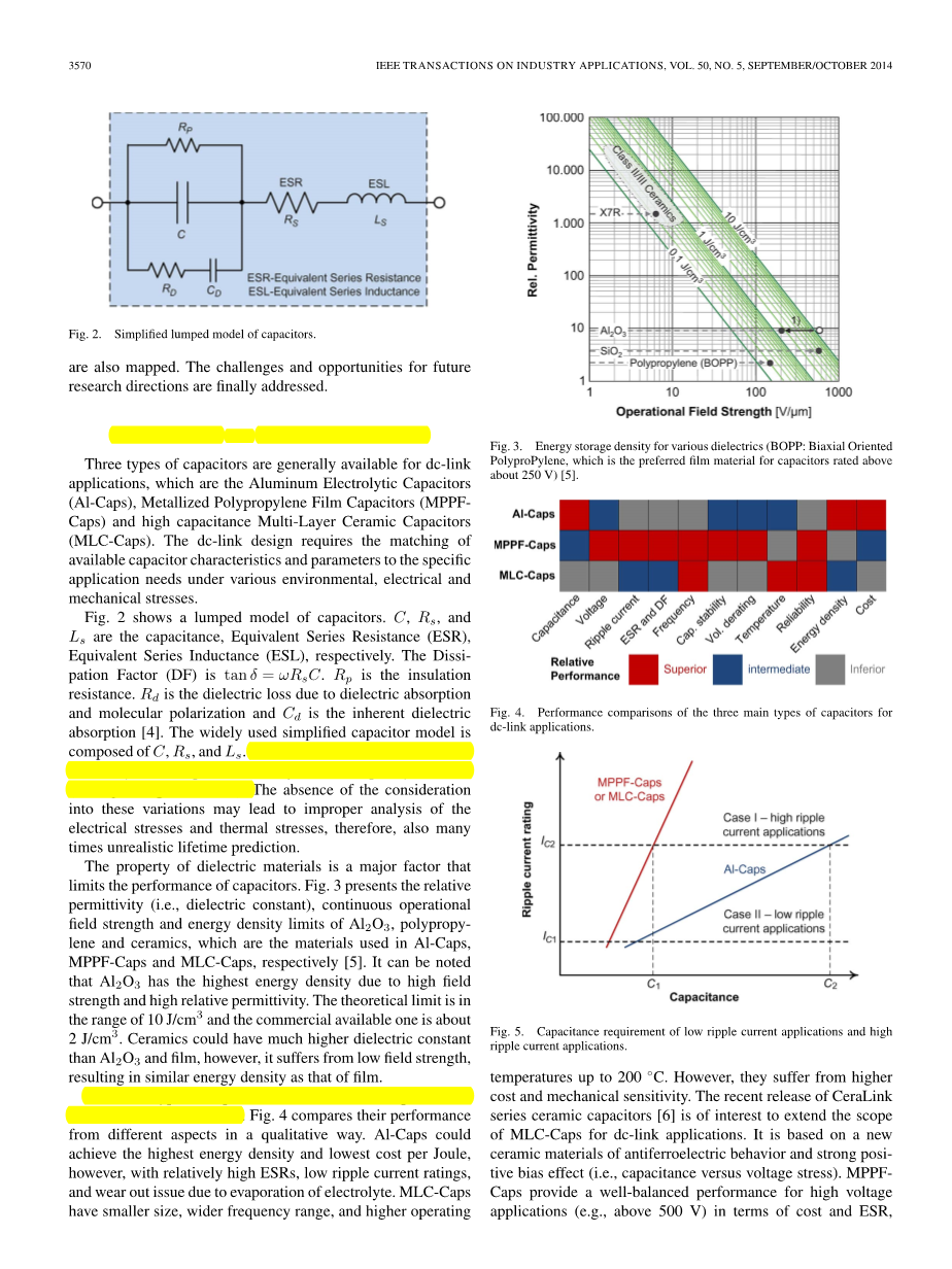 高功率密度电力电子系统趋势的电容器[3]。克服上述挑战的努力可以分为三类:a)改进电容器技术并内置改进和预定的可靠性,b)基于当前电容器的最佳dclink设计解决方案,以实现适当的鲁棒性裕度和成本效益c)状态监视的实施,以确保可靠的现场操作和预防性维护。通过利用新型介电材料和创新制造工艺的进步优势,领先的电容器制造商一直在不断发布具有更高可靠性和成本性能的新一代产品。这些电容器在特定直流链路设计中的正确应用同样重要,因为工作条件(例如,温度,湿度,纹波电流,电压)可能会严重影响电容器的可靠性。与第一类相比,从功率电子设计的角度来看,后两者更为相关,因此本文将对其进行回顾。此外,还给出了适用于直流链路应用的电容器的比较。失效模式,失效机理,相应的临界应力及其寿命模型也被映射。最终解决了未来研究方向的挑战和机遇。