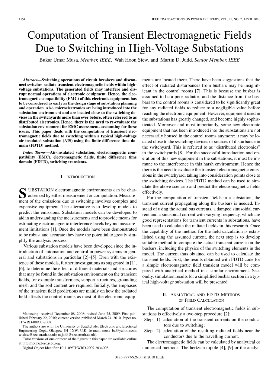 电磁场可以通过分析或数值方法来计算。赫兹偶极子方法[4],[9]或分析方法[10]-[12]假定线路或导体(在这种情况下为变电站母线)为圆柱形。假定母线半径与瞬态电流的最小波长相比较小,因此该电流可以看作是细丝电流。