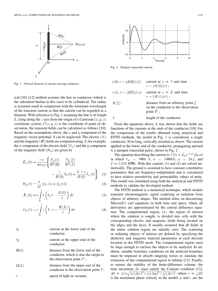 从上面的等式可以看出,场是导体[10]端部电流的函数。为了比较使用分析方法和V方法获得的结果,我们考虑了图1中的模型,该导体是长30m的单根导体,如图所示垂直放置。施加在导体下端的电流向上传播是一个衰减正弦脉冲,如图2所示。