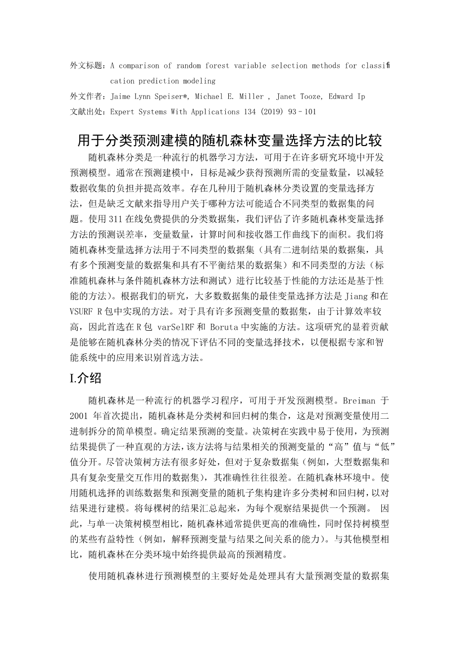 用于分类预测建模的随机森林变量选择方法的比较外文翻译资料 2022-08-10 15:20:47 英语原文共 9 页,剩余内容已隐藏,支付完成后下载完整资料 英语译文共 14 页,剩余内容已隐藏,支付完成后下载完整资料 资料编号:[238547],资料为PDF文档或Word文档,PDF文档可免费转换为Word 原文和译文剩余内容已隐藏,您需要先支付 30元 才能查看原文和译文全部内容!立即支付 发小红书推广免费获取该资料资格。点击链接进入获取推广文案即可: Ai一键组稿 | 降AI率 | 降重复率 | 论文一键排版 PREVIOUS NEXT 您可能感兴趣的文章 精益和自动化生产及物流外文翻译资料 精益自动化生产和物流外文翻译资料 精益化和自动化的制造和物流外文翻译资料 精益自动化的制造和物流外文翻译资料 生产与物流的精益化和自动化外文翻译资料 无刷直流电机闭环速度控制原型设计与实现方法外文翻译资料 无线HART网络控制外文翻译资料 基于单片机的智能鱼缸的设计外文翻译资料 基于单片机的盆花自动浇水控制系统设计外文翻译资料 基于PLC的空气循环净化系统外文翻译资料