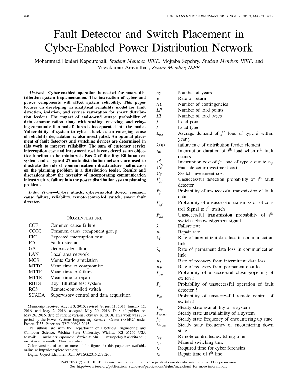索引术语ー网络攻击、网络启用设备、共因故障、可靠性、遥控开关、智能故障检测器。