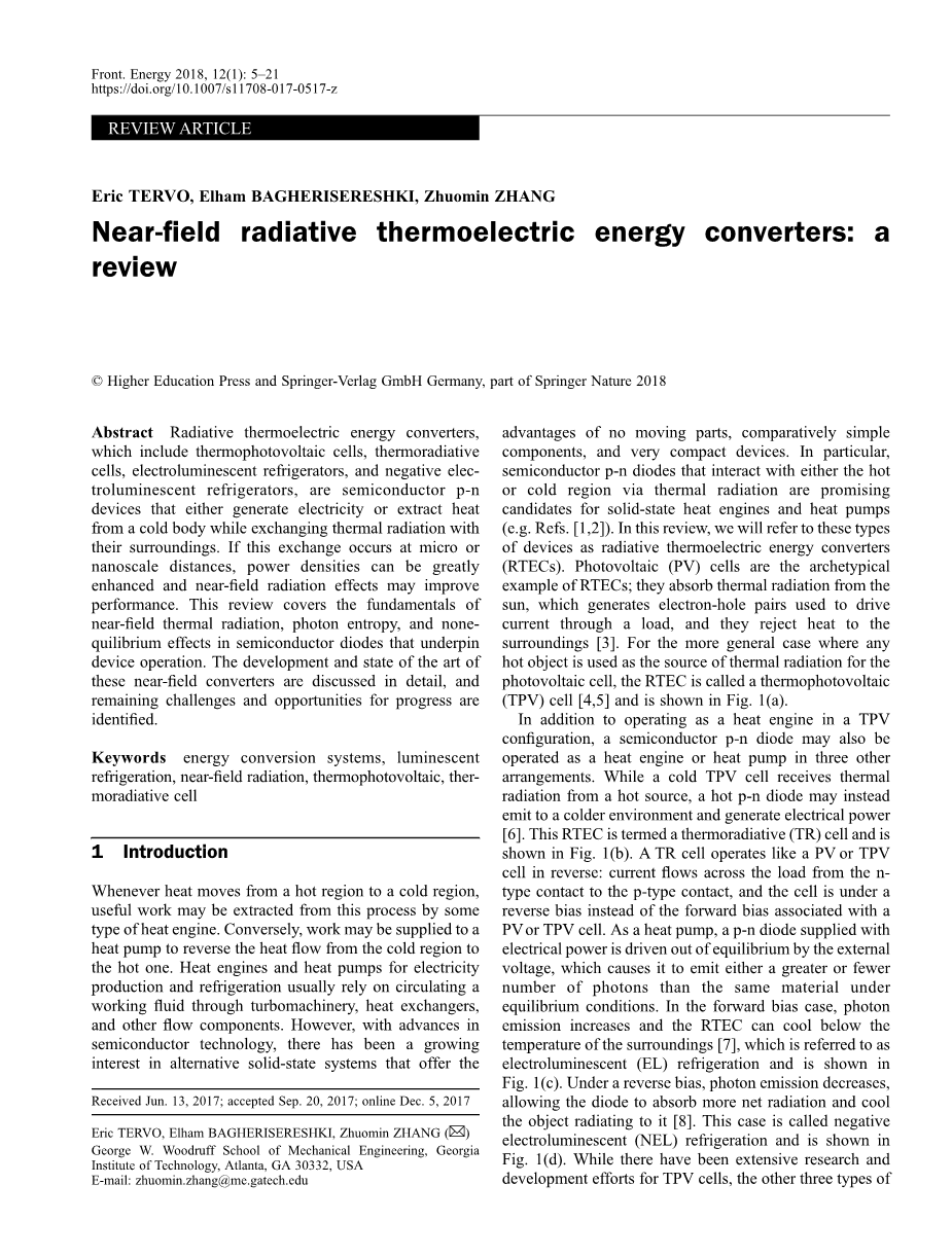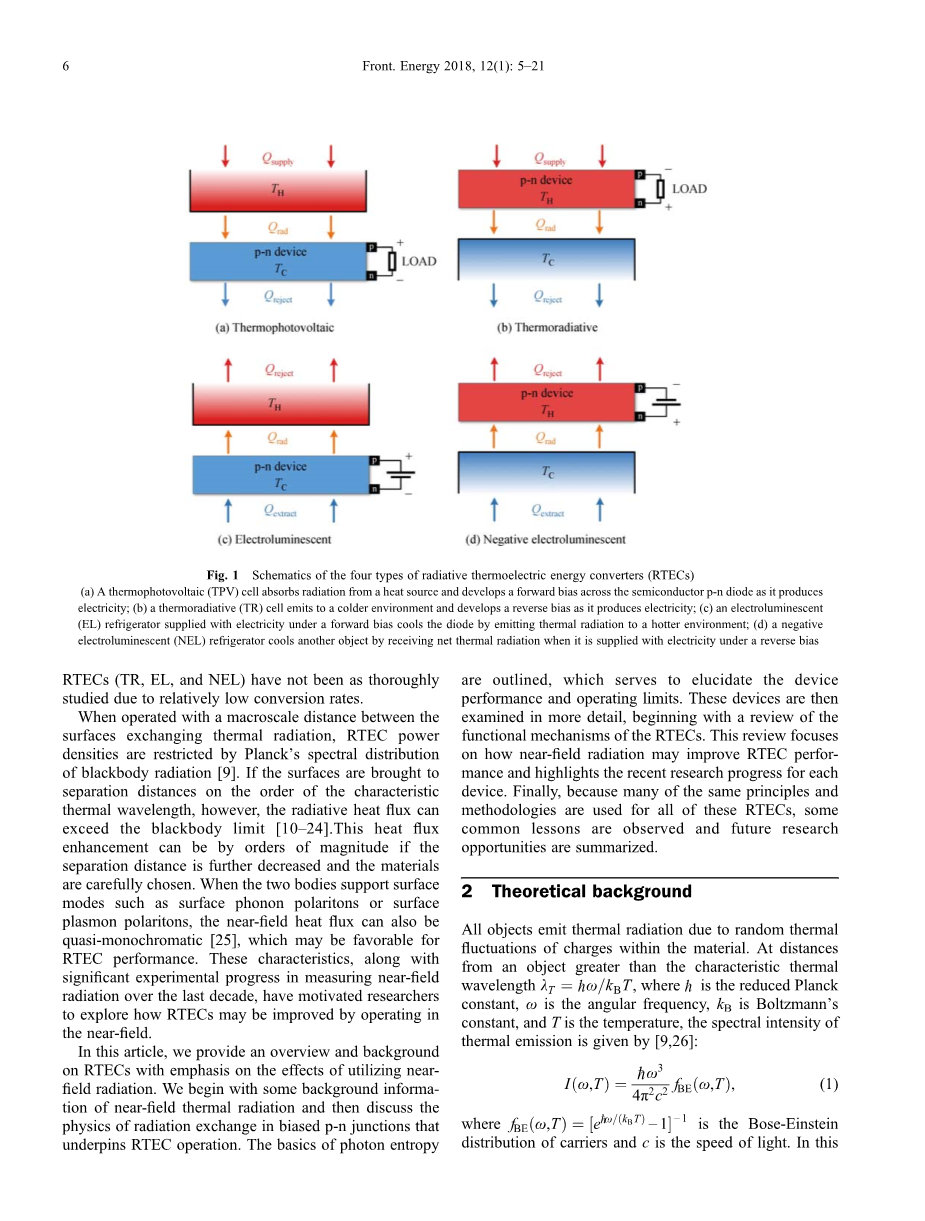 当热从一个热的区域转移到一个冷的区域时,某种热机可以从这个过程中提取有用的功。相反地,功可以提供给热泵,使热从冷区流向热区。用于电力生产和制冷的热机和热泵通常依赖于通过涡轮机、热交换器和其他流动部件使工作流体循环。然而,随着半导体科技的进步,人们对具有无运动部件、元件相对简单和器件非常紧凑优点的非传统的固态半导体系统越来越感兴趣。特别是,半导体p-n二极管,通过热辐射与热或冷区相互作用,是固态热机和热泵的有希望的候选者。(参考文献。[1,2])。在这篇综述中,我们将这些类型的设备称为辐射热电能量转换器(RTECs)。光伏电池是典型的RTECs;它们吸收来自太阳的热辐射,从而产生用于驱动电流通过负载的电子空穴对,并将热量散发到周围[3]。对于更一般的情况,任何热的物体都被用作光伏电池的热辐射源,RTEC被称为热光电(TPV)电池[4,5],如图1(a)所示。
