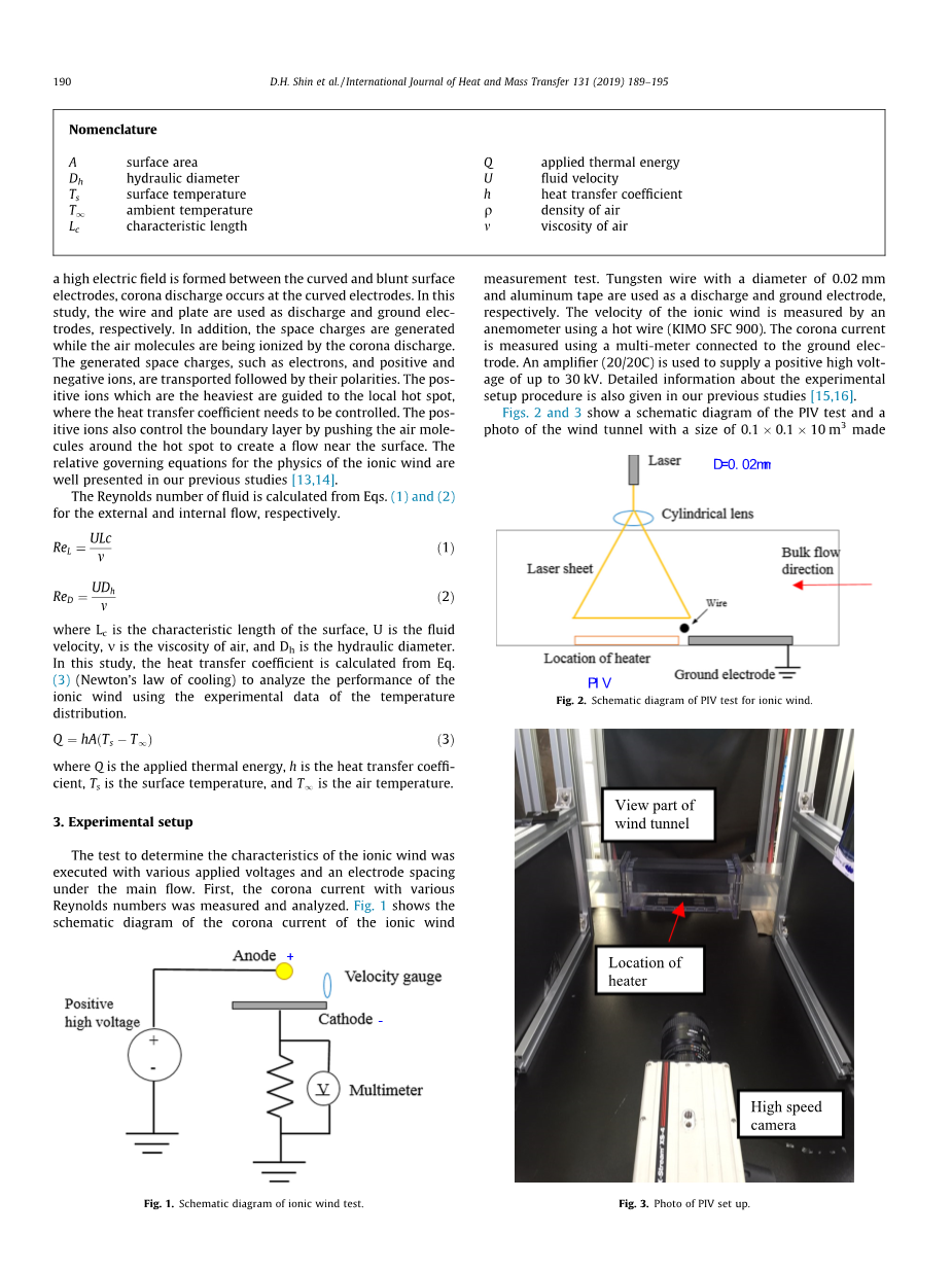 图2和图3分别显示了PIV测试的示意图和尺寸为的聚碳酸酯制风洞的照片。将电线和导电胶带安装在风洞的视线部分,并将板式加热器插入中央区域的底部主体中。将硅橡胶加热器插入铜块中,其温度范围在0和150℃由直流电源(E3633A)控制。将K型热电偶连接到加热器,以测量温度变化和离子风的对流系数。涡轮风扇用于诱导大流量通过压力室进入风洞。使用功率为6 W的二极管激光器(MGL N-532A)通过用于可视化平面的圆柱透镜形成激光片。使用高速相机(Phantom MIRO C110)捕获具有框架的粒子运动相对于雷诺数在100到2000 fps之间的速率。PIV的颗粒来源是橄榄油,由颗粒播种发生器喷洒了10 um直径的颗粒。环境条件由固定温度(25℃)和相对湿度(25%)控制。