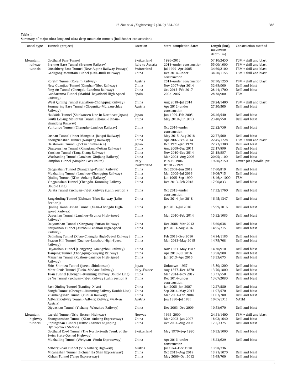 随着社会、经济和交通运输网络的发展,在山区修建超长超深隧道已成为不可避免的趋势。超长超深隧道一般定义为长度超过10公里、深度超过500米的隧道。 山岭隧道主要由公路隧道、铁路隧道和水工隧道组成。 尽管超长超深隧道具有安全、环境友好、速度快等优点,但工程建设、施工和运营的成本和难度是相当可观的。 表1列出了世界各地已经建成或正在建设的超长超深山隧道。 据不完全调查,国内超长超深山隧道56条,国外超深山隧道21条。 其中,全长57.1公里的圣哥达基础隧道是世界上最长、最深的隧道,全长32.7公里的关角隧道是世界上海拔3000米以上的最长隧道,全长18公里的秦岭中南山公路隧道是世界上最长的双线公路隧道,全长16公里的天花山秦岭隧道是亚洲最长的单洞双线高速铁路隧道。
