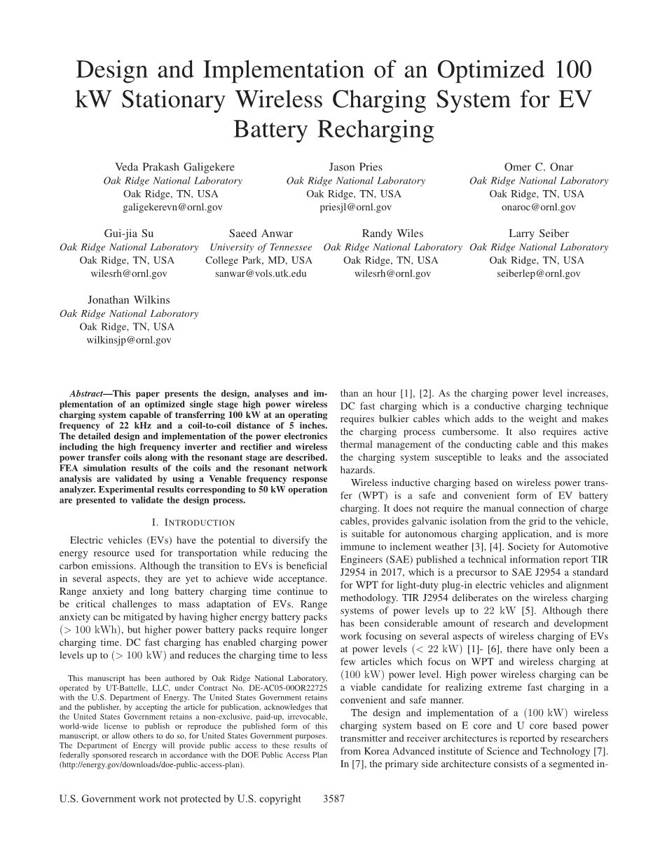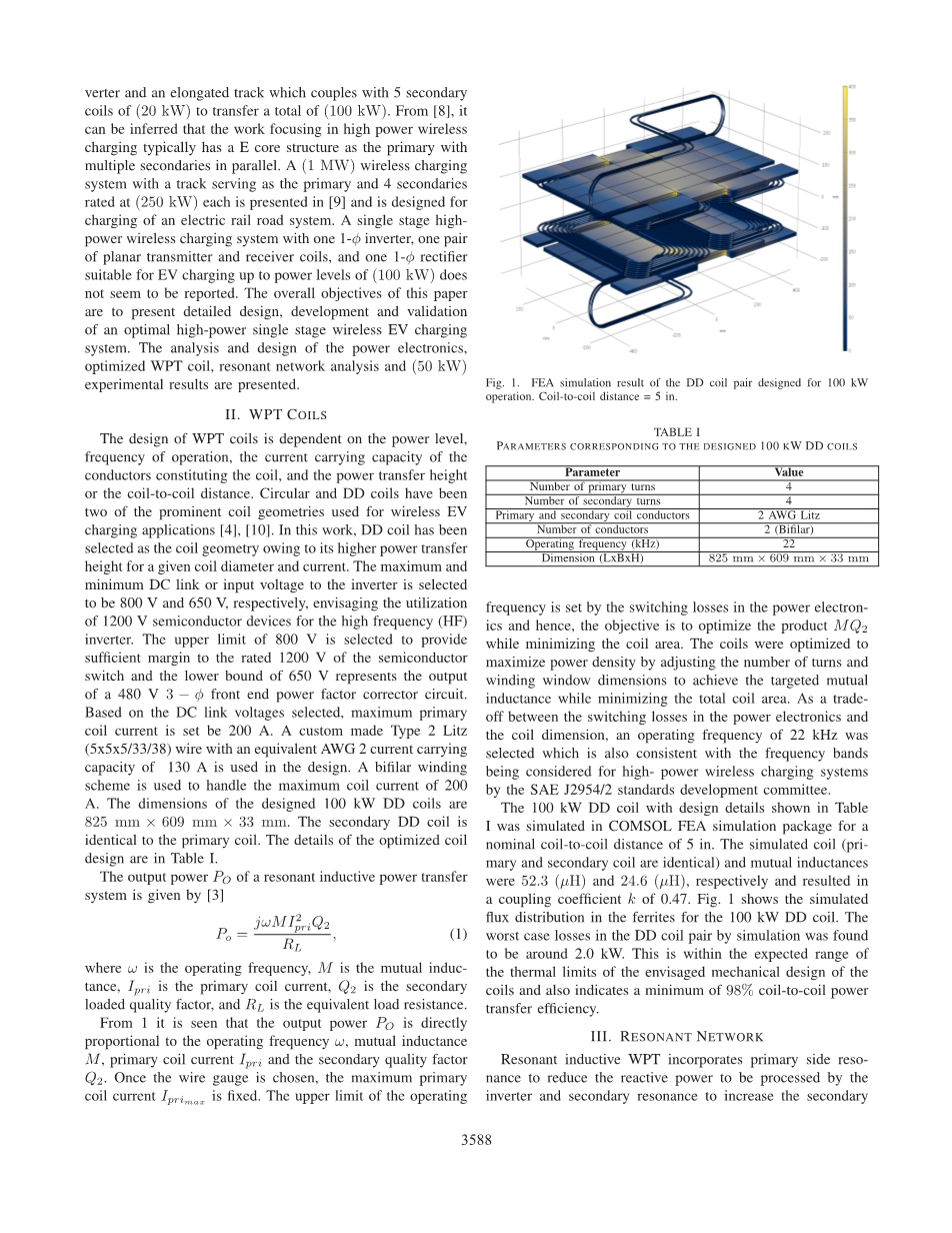 基于无线功率传输(WPT)的无线感应充电是一种安全方便的EV电池充电形式。它不需要手动连接充电电缆,并且能在输电网和车辆之间提供电流隔离,这一点适用于自动充电应用,并且更不容易受到恶劣天气的影响[3],[4]。汽车工程师学会(SAE)在2017年发表了一份技术信息报告TIR J2954,这是SAE J2954的前身,是轻型拔插式电动汽车WPT的标准和校准方法。TIR J2954对功率水平高达22kW的无线充电系统进行了研究[5]。虽然有相当多的研究和开发工作集中在功率水平(lt;22kW)的电动汽车无线充电的几个方面[1]-[6],但只有几篇文章集中在(100kW)功率水平下的WPT和无线充电。大功率无线充电可以是一个在方便和安全的方式下实现极快充电的可行的候选。
