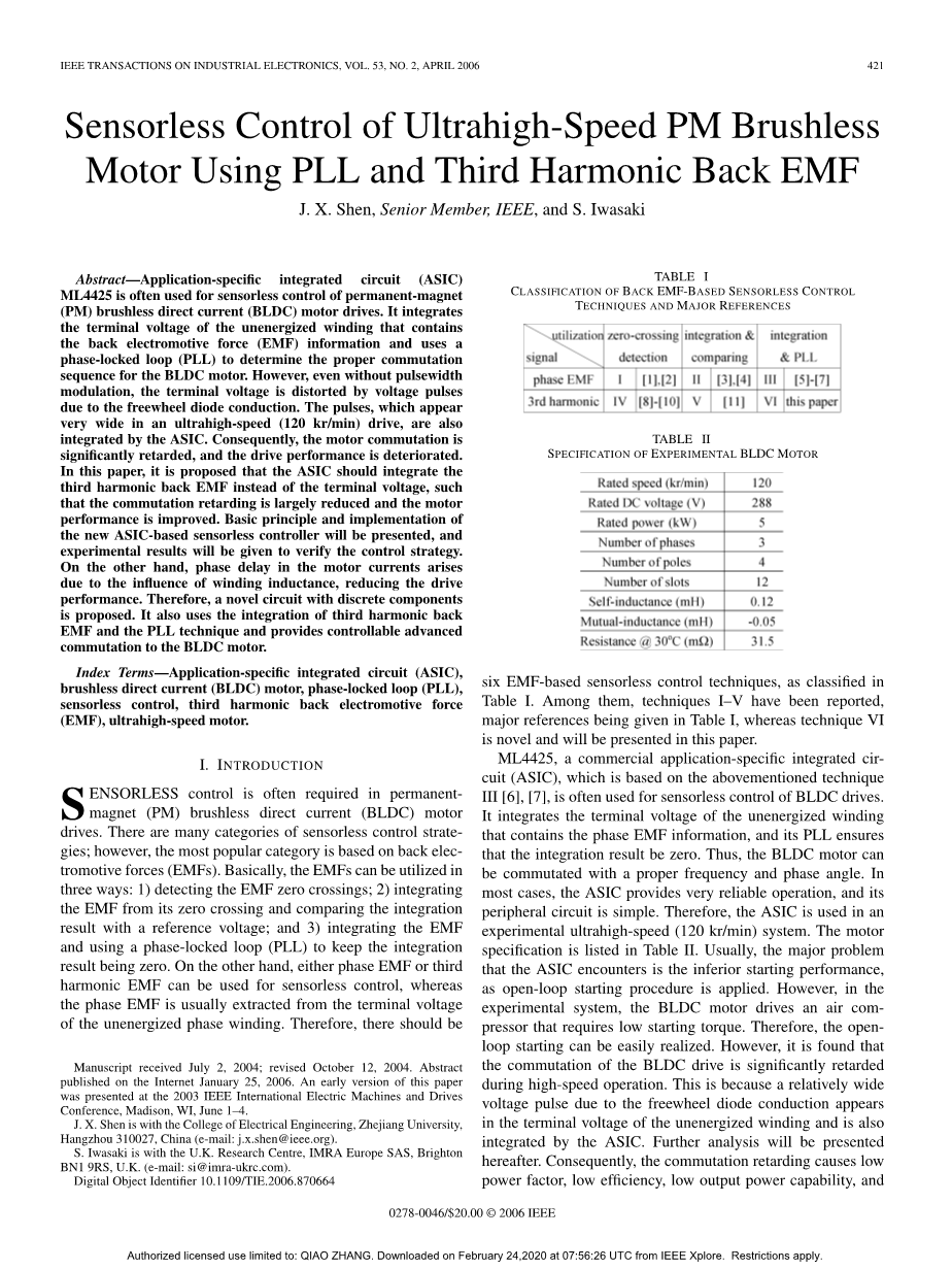 索引项-应用专用集成电路(ASIC)、无刷直流(BLDC)电机、锁相环(PLL)、无传感器控制、三次谐波反电动势(EMF)、超高速电机。