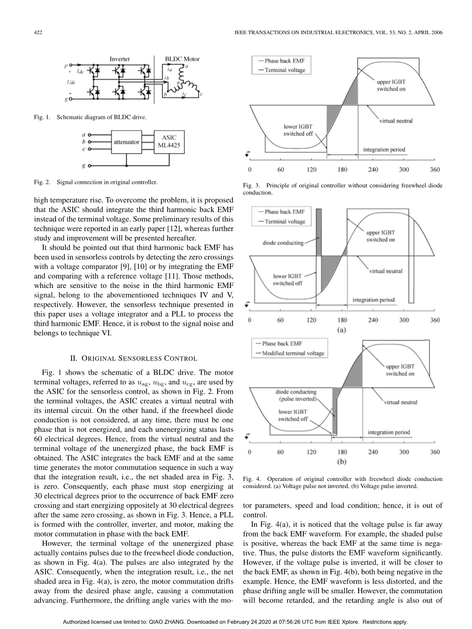 图7示出了改进的无传感器控制器的原理。在稳态下,三次谐波电动势的积分结果,即净阴影区为零。因此,在反电动势过零发生之前,逆变器IGBT在30电度下被关断,而在过零之后,同一相的另一IGBT在30电度下被关断,因此,正常换相被实现。然而,在暂态过程中,如果电机换相提前,积分结果为负。这将降低锁相环中压控振荡器(VCO)的输入电压,从而降低电机换相频率,直到换相不再提前。相反,如果换相延迟,积分结果为正;因此,VCO输入和电机换相频率将增加,直到换相不再延迟。此外,从图7可以看出,自由轮二极管的传导在ASIC集成的信号中不呈现电压脉冲;因此,在稳态期间,它不会导致电机换相中的延迟或前进。